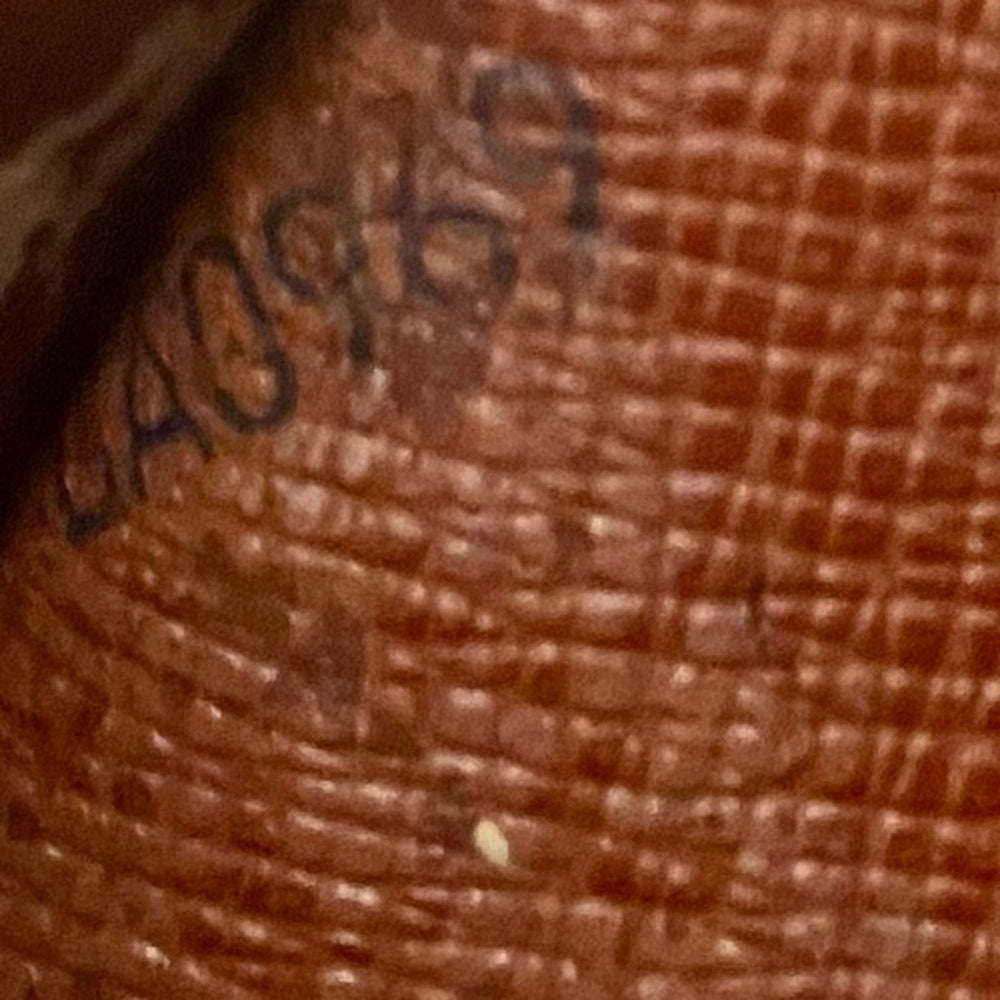 This is a pre-owned bi-fold wallet made of monogram brown leather. This wallet has a slots for bills, IDs and Credit cards. Also, it has a pocket for coins or keys. Folded it measures about 5.5 inches long and 4 inches wide. It has edge wear repairs on folded areas and zipper on coin pocket are missing or removed, soiling, discoloration and fading as shown in photos. Crossbody chain is about 40 inches long and it is not original or was added to make it as a crossbody. Date Code: CA0969- Made in Spain, June 1999.