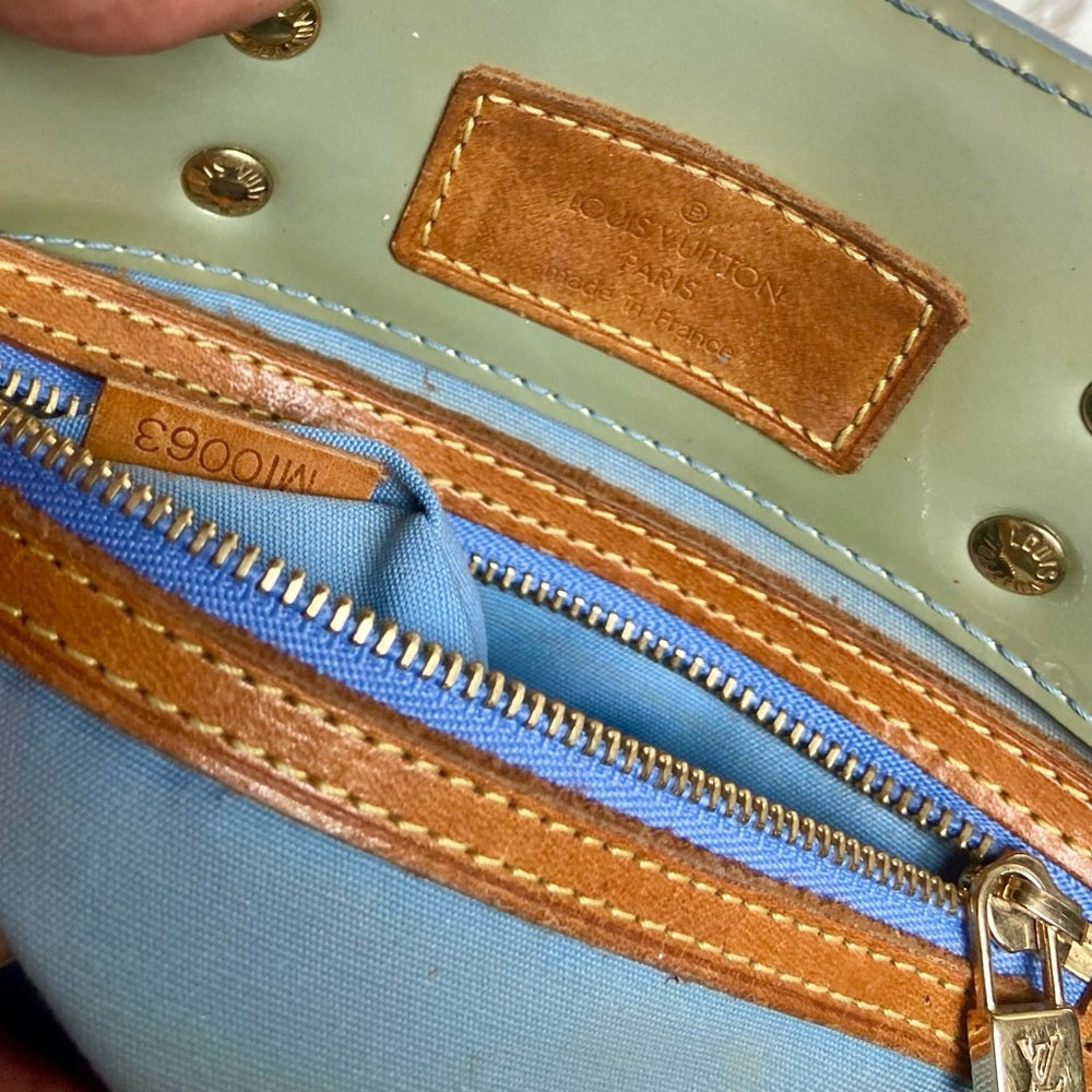 This is a pre-owned Louis Vuitton small Hand Bag -Tote, made of green Vernis. It measures 11 inches long, 7 inches high and 4 inches wide. It has minimal issues such as scratches, discoloration, scuffs and the straps were reinforced with added rivets to keep it intact. Please supersize photos for condition details. Date code: MI0063 Made in France, June 2003.