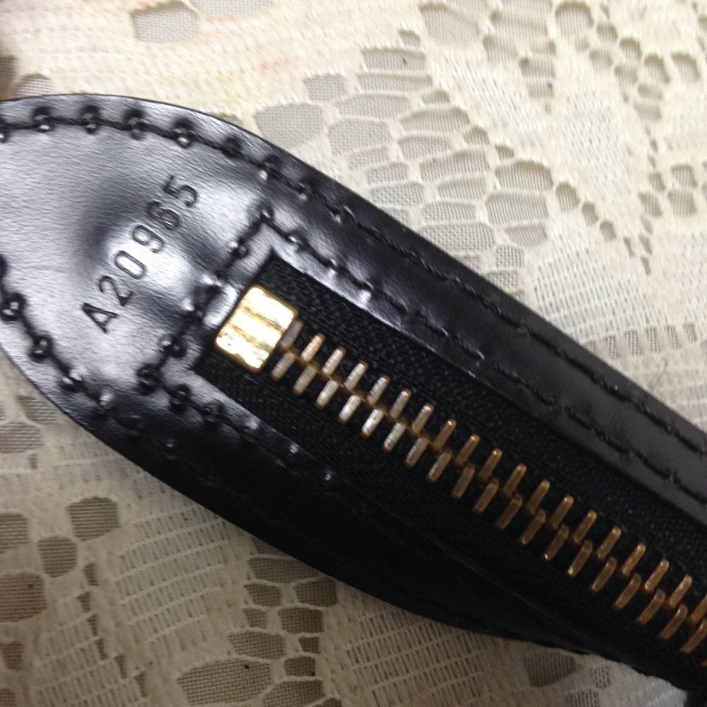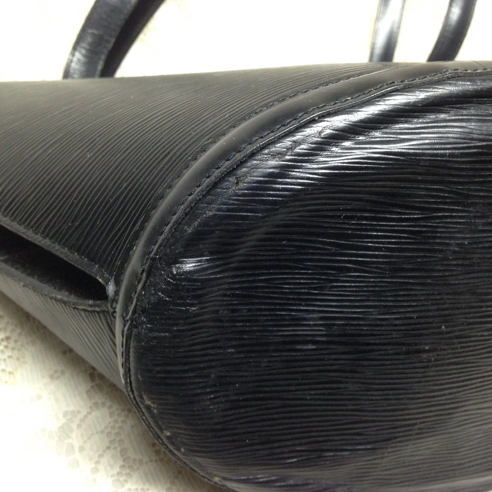 This is a beautiful , pre-owned large tote made of black epi leather. It measures about 18 inches long, 12 inches wide and 7 inches deep. The bottom has a shape irregularity and signs of repair but overall it is in good condition with minimal wear such as discoloration, soiling, spots, etc. as shown in photos. Louis Vuitton, Paris France. Date code: A20965.