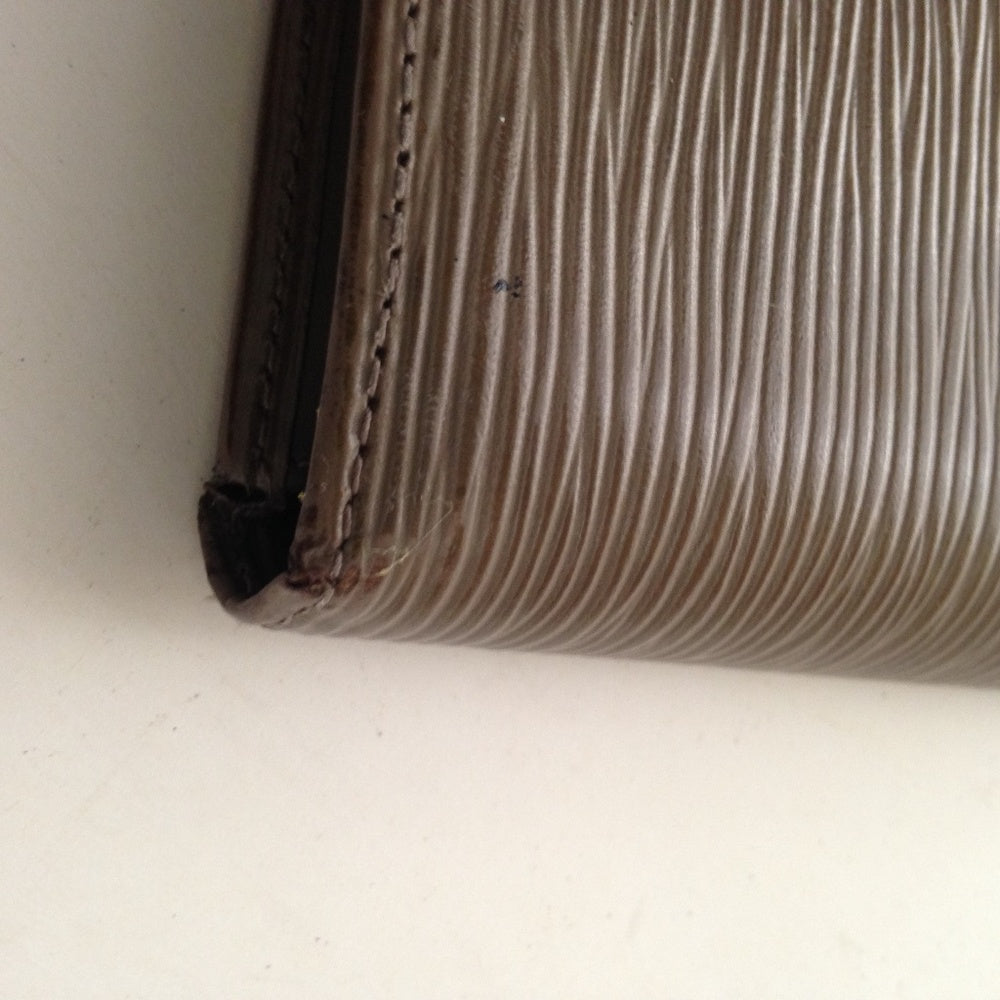This is a pre-owned bi-fold wallet made of tan brown Epi leather. This wallet has a slots for bills, IDs and Credit cards. Also, it has a pocket for coins or keys. Folded it measures about 5 inches long and 4.5 wide. It is in good condition with minimal signs of wear such as soiling, edgewear on folded corners as shown in photos. Date code: MI0011 - Made in France- January 2001.