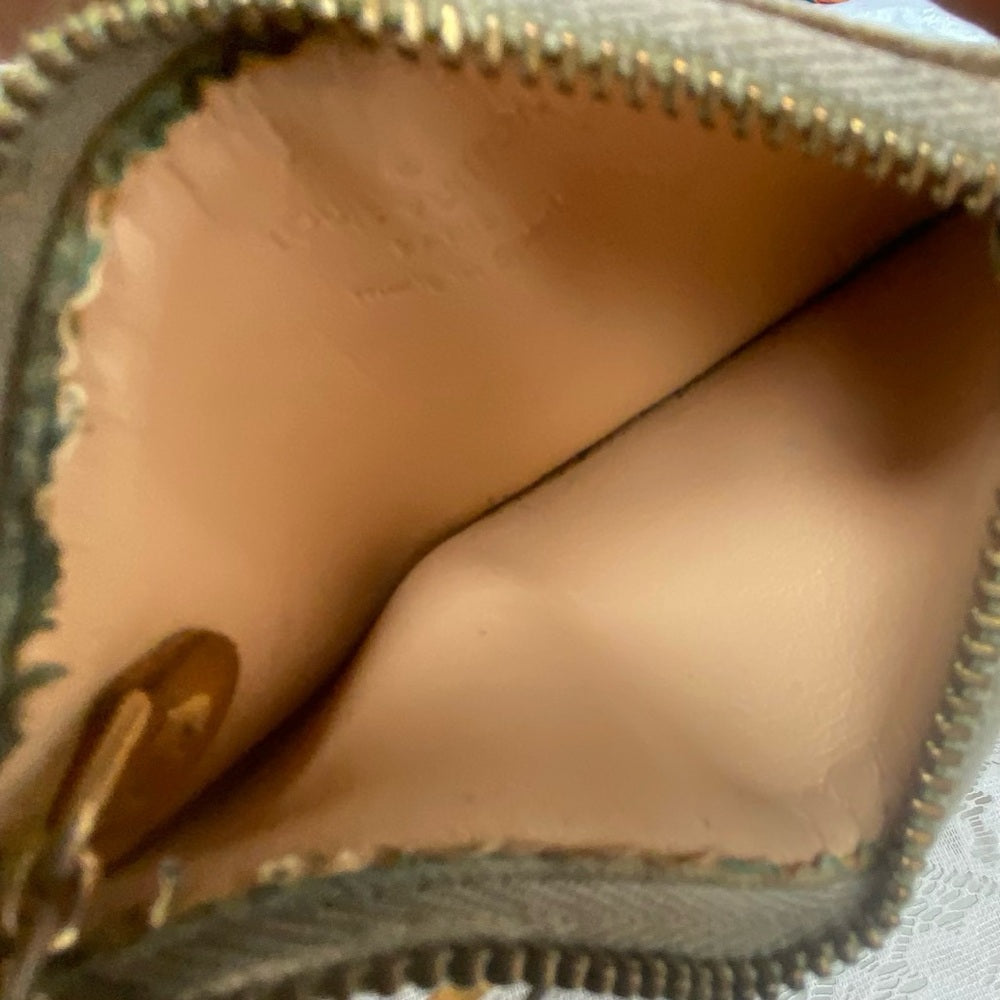 This is a pre-owned coin purse and key case made of white leather with multi color monogram. This purse can accomodate coins, keys, folded bills, ID or Credit card. It measures about 5 inches long and 2.75 inches wide. It is in distressed condition with normal wear such discoloration, fading ,soiling and metal wear as shown in photos. It is marked: Louis Vuitton, Paris, Made in Spain.
