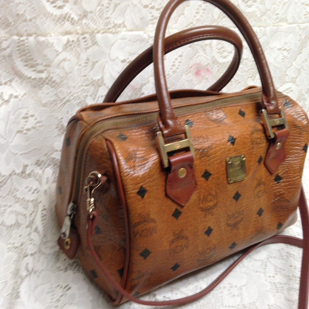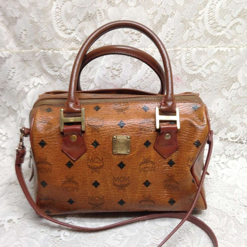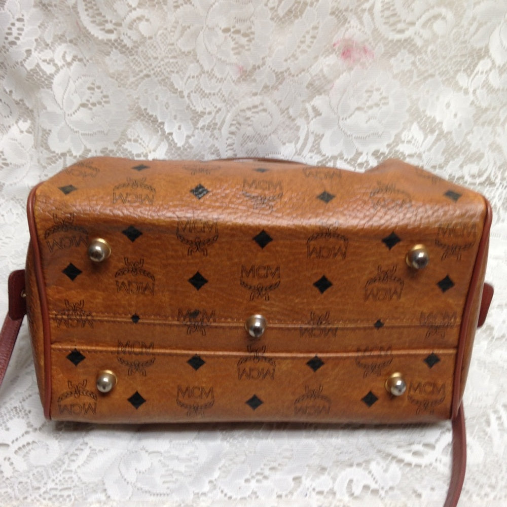 This is a pre-owned Tan monogram coated canvas handbag-crossbody. It measures about 11 inches long, 7 inches wide and 7 inches high and comes with a replaced or added 45-inch cross body strap. It is in good condition with minimal wear such as discoloration, soiling, and metal wear as shown in photos. It is marked: MGM, Handmade, Made in West Germany.
