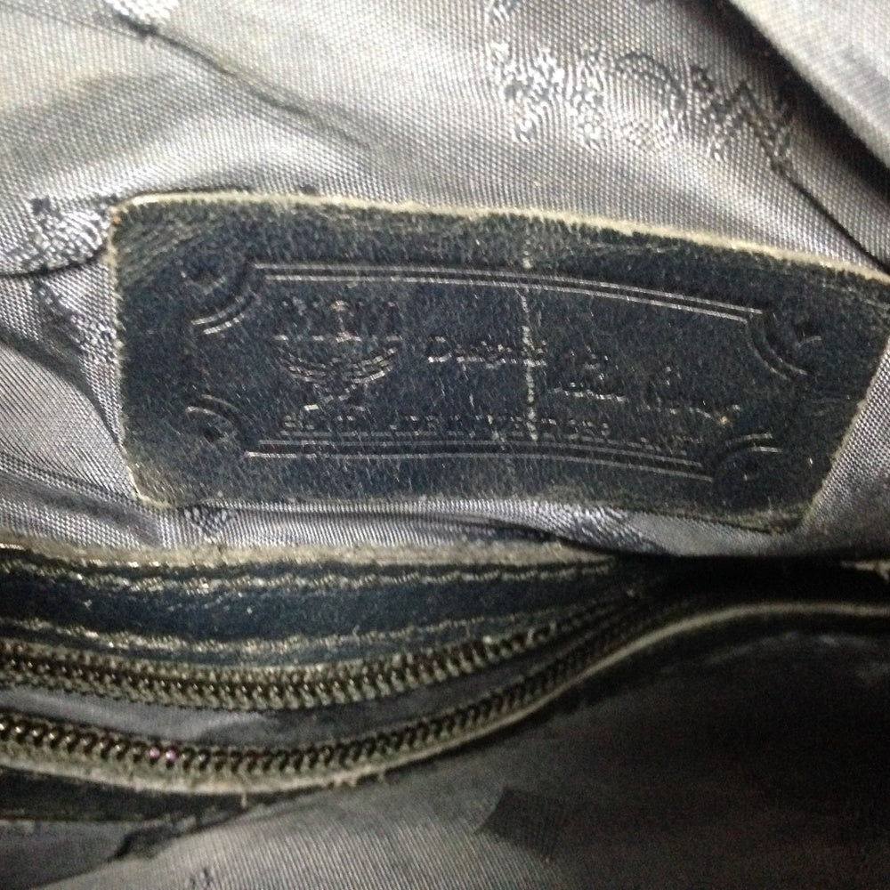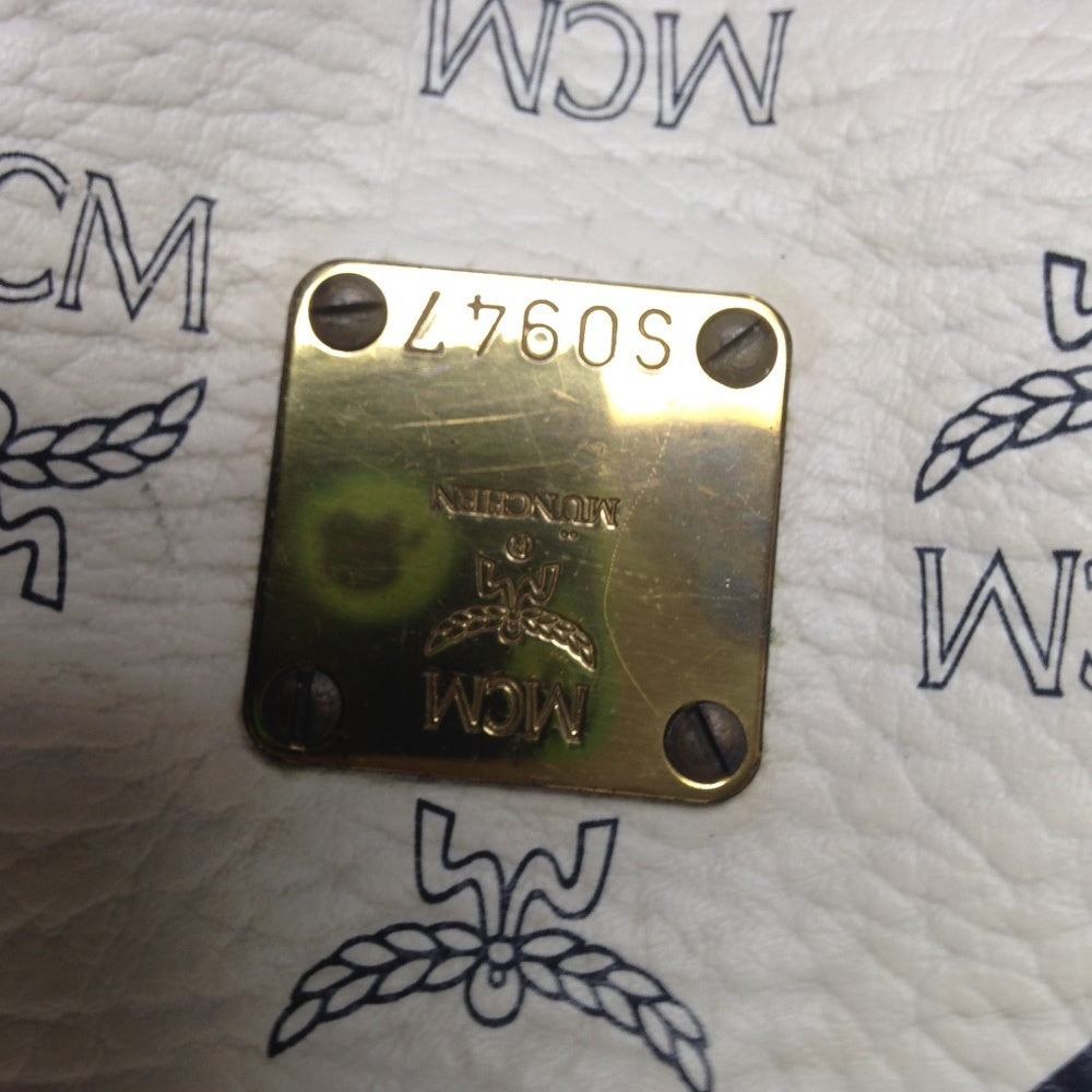 This is a beautiful white monogram coated canvas with dark blue leather handle and trim. It measures about 14 inches long, 13inches wide and 7 inches deep and comes with a cross body strap. It is in good condition with minimal wear, discoloration and soiling, metal wear as shown in photos. It is marked: MGM, Handmade, Made in West Germany.