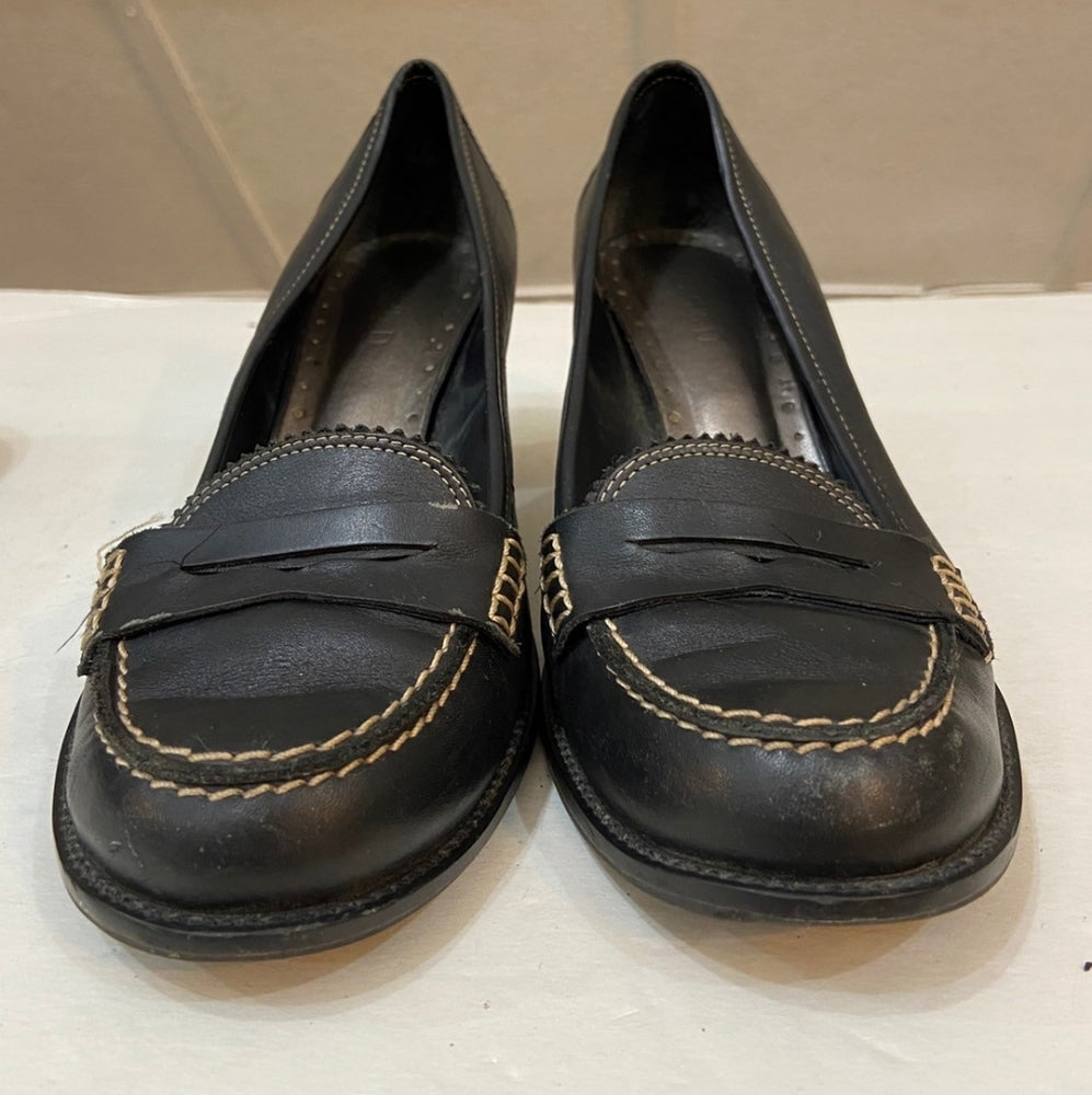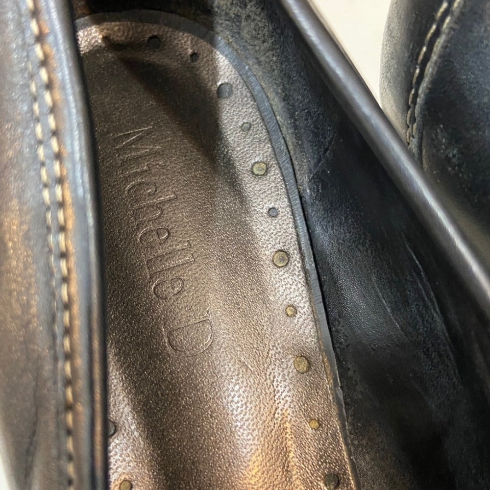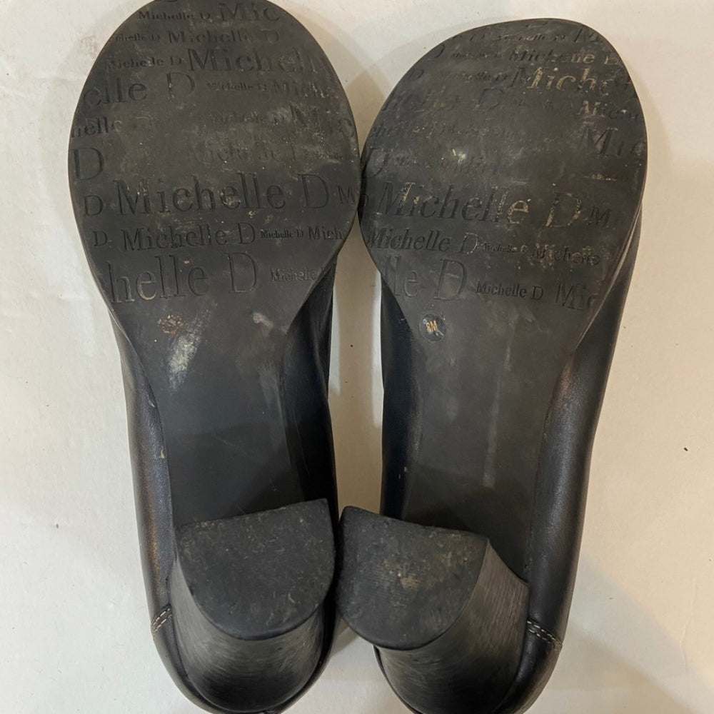 This is a beautiful preowned pair of shoes made of black leather. Size 8, measures 10 inches long, 3.5 inches wide, and 2 inches high. It is in good condition with some wear as shown in photos. It is marked Michelle D.