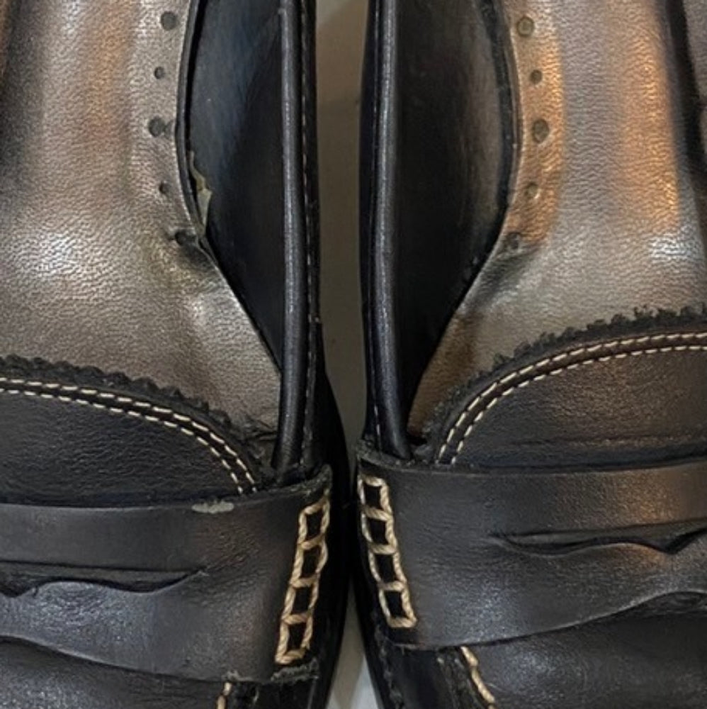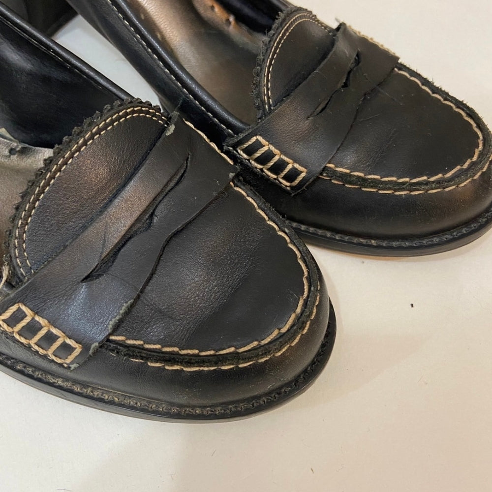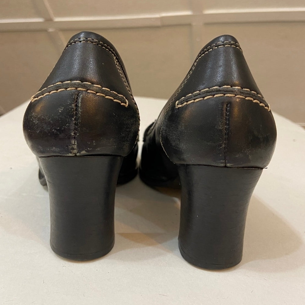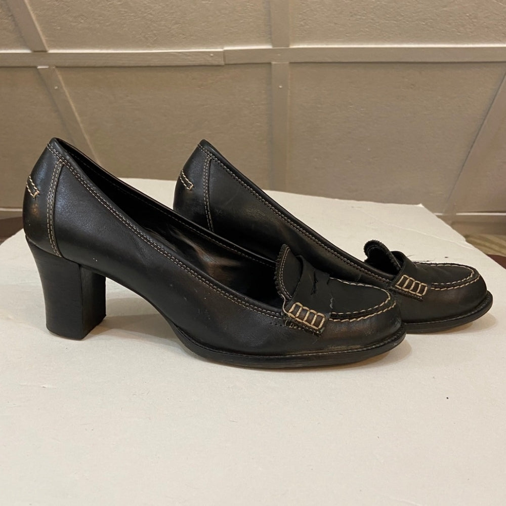 This is a beautiful preowned pair of shoes made of black leather. Size 8, measures 10 inches long, 3.5 inches wide, and 2 inches high. It is in good condition with some wear as shown in photos. It is marked Michelle D.