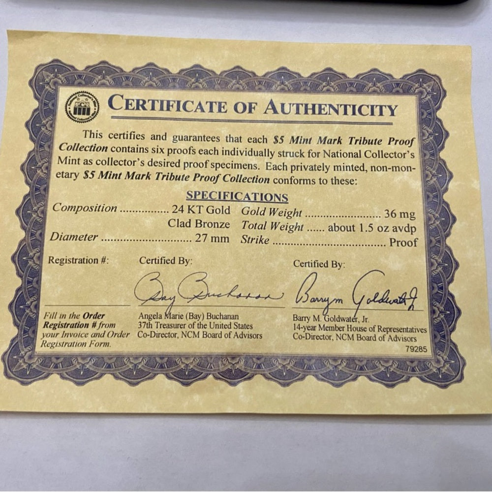 Tribute coins feature historic and popular designs from bullion coinage, but with no precious metal content and no legal tender status. These design are struck on standard alloy blanks and are finished with a thin layer of 24 karat gold to help replicate the appearance of the rare 1911 $5.00 gold coin. It is in mint condition as shown in photos and comes with a copy of the certification from the National Collectors Mint, Inc. Certified by Angela Marie Buchanan and Barry M. Goldwater, Jr.