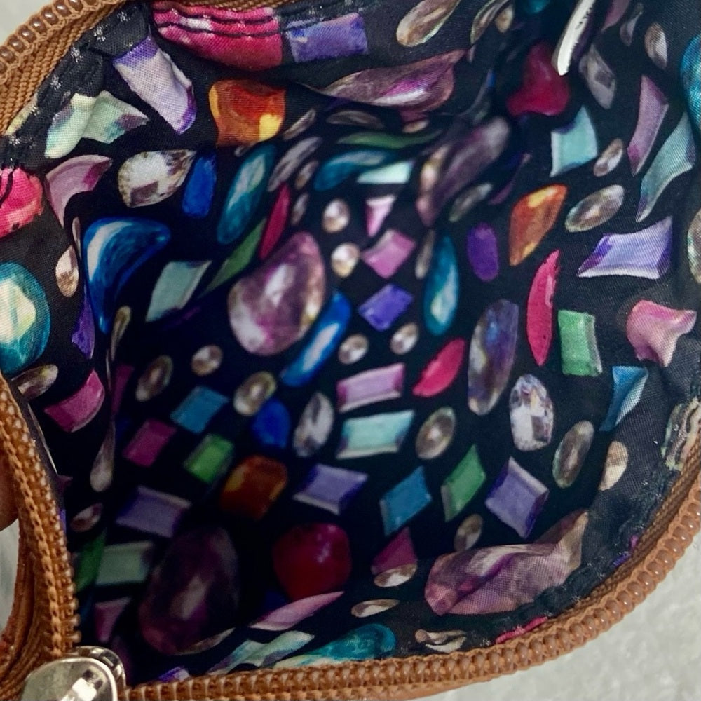 This is a beautiful crossbody pouch made of black patent with tan leather trim and comes with a 48-inch crossbody strap. It measures 6.5 inches long and 5 inches wide. It is in good condition with minimal wear as shown in photos. Please supersize photos for more detailed conditions.