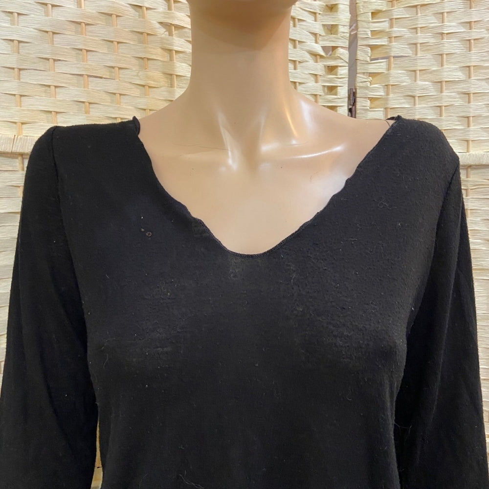 This is black longlseeved top with a lace trim at the bottom. It is in okay condition with some wear as shown in photos.