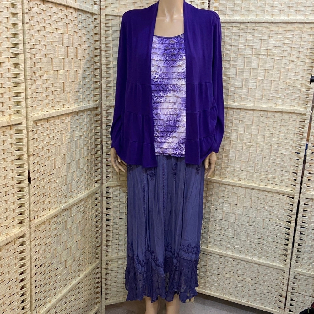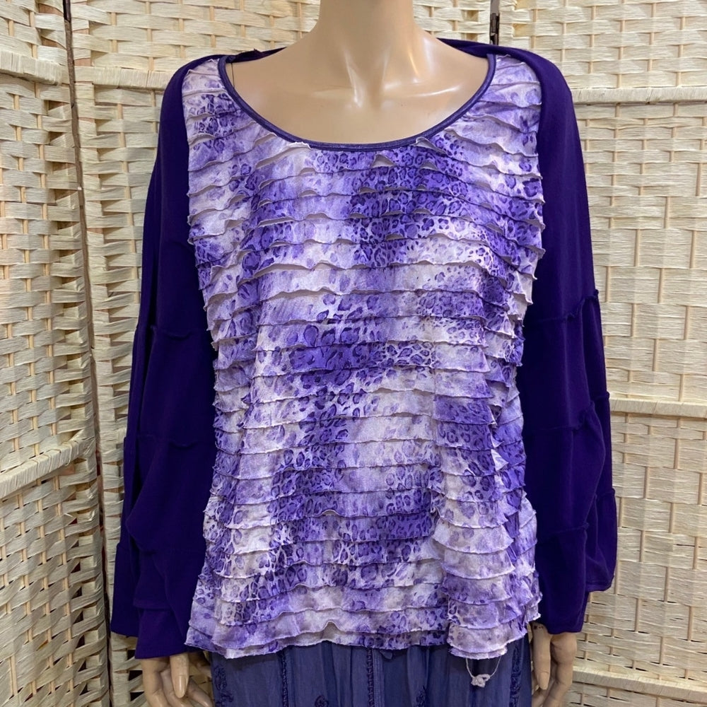 This is a beautiful frilly purple longsleeve top with a faux cardigan. It is from Notations and made in the USA. It is in good condition as shown in photos. This will fit size: L, actual measurements to follow: