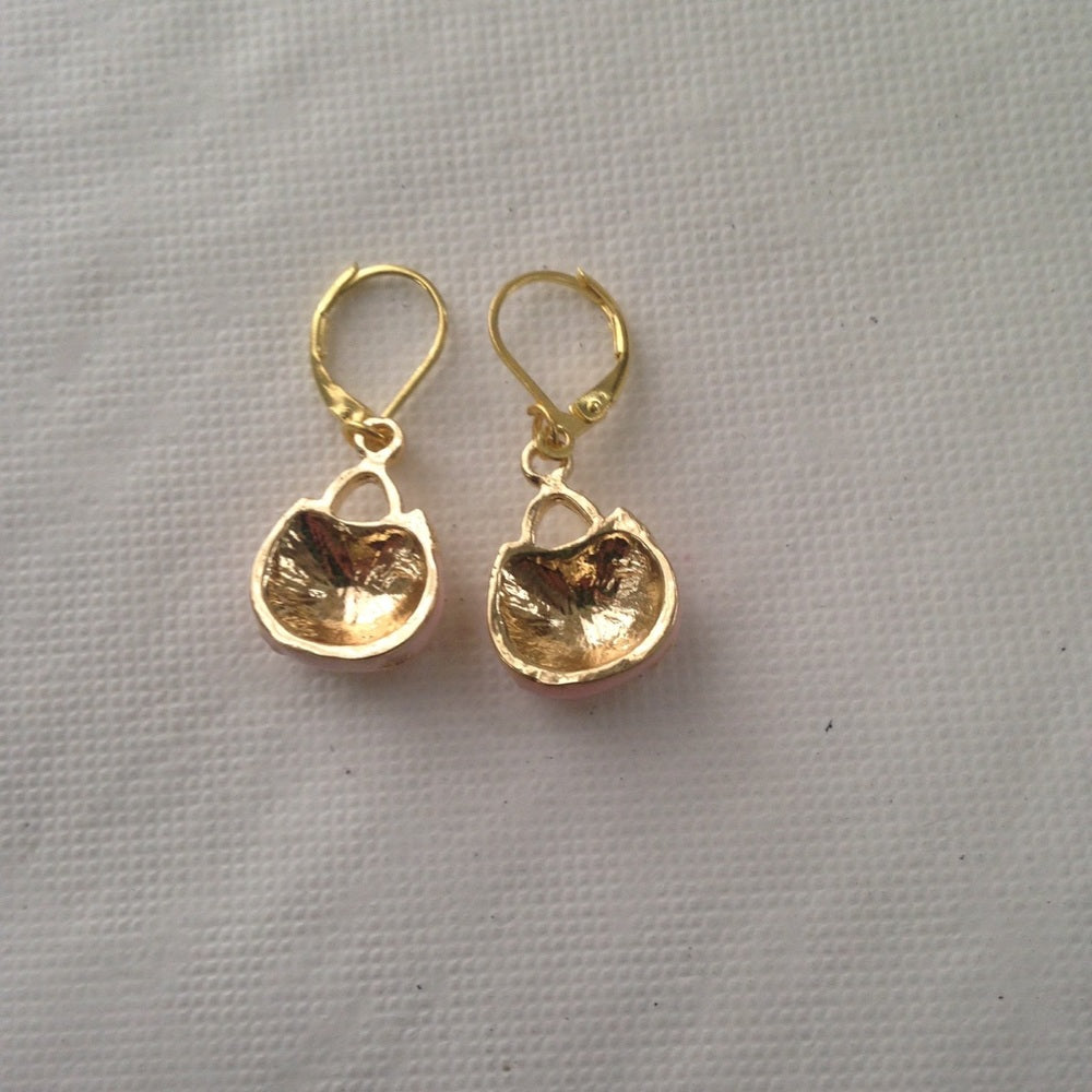 This is a beautiful, custom made, gold Tone Enamel Necklace and Earrings Set. This set has charms depicting pink enamel purses decorated with indented round and diamond shape design that resemble rhinestones. The dangling earrings measures about 1.5 inches long and the gold Tone Necklace measures about 18 inches long. This set is New without tags as shown in photos.