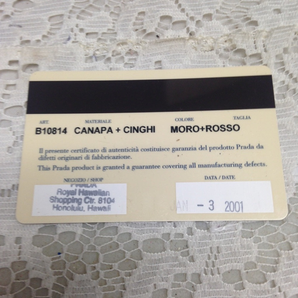 This is a beautiful dark brown canvas Shoulder bag with red Leather trim and handle. It measures about 11.5 inches long, 10.5 inches high and 5 inches wide. It comes with a 16-inch long hand or shoulder strap. It is in good condition with minimal wear such as discoloration, soiling and scuffs as shown in photos. Please supersize for details. It is marked: Prada Milano, Made in Italy.