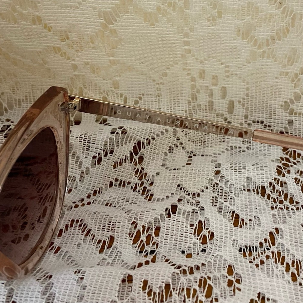 This is a beautiful, stunning, oversized cat-eye sunglasses and it measures about 6 inches long and the lenses is about 2.5 inches high and 3 inches wide. It is in very good condition, probably never been used as shown in photos. The temples are marked: Quay Australia, Steal A Kiss III. It comes with original clear case.