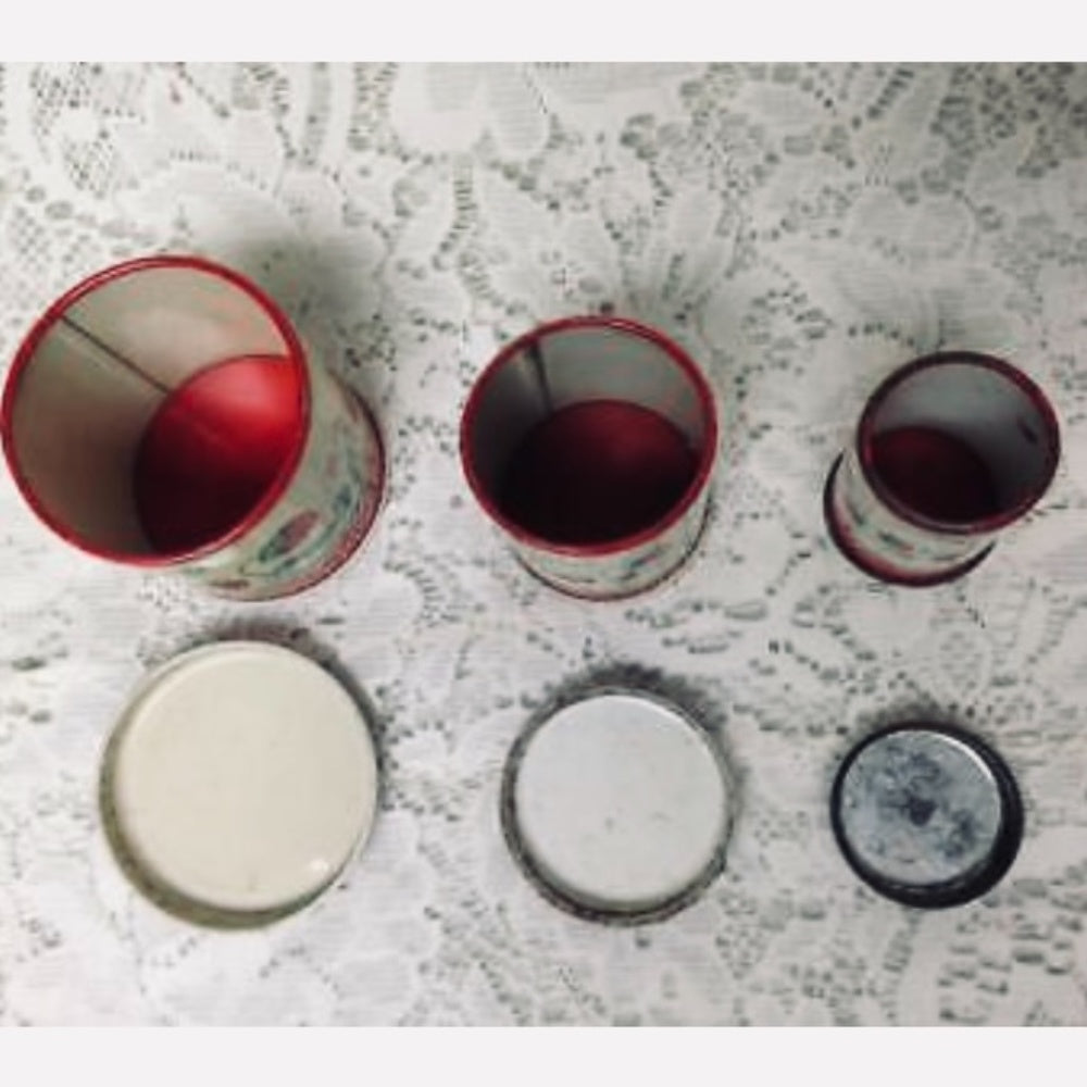 All canisters are in good vintage condition with the usual age wear such as paint loss, surface rust, scratches, soiling, etc., common to this type of tin sets. It is marked: Wolverine, Made in USA. This set if complete with the bread box and flour canister is worth $200-275.00. (1870-1970 Housekeeping Toys page 104) Package weight is about a pound.