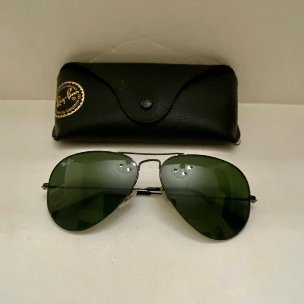 This is a pre-owned black, large Aviator sunglasses and it comes with a black Ray-Ban case. It is in good condition with minimal wear on the side inner arms as shown in photos. It is marked: Ray-ban Made in Italy. Please supersize photos for condition details.