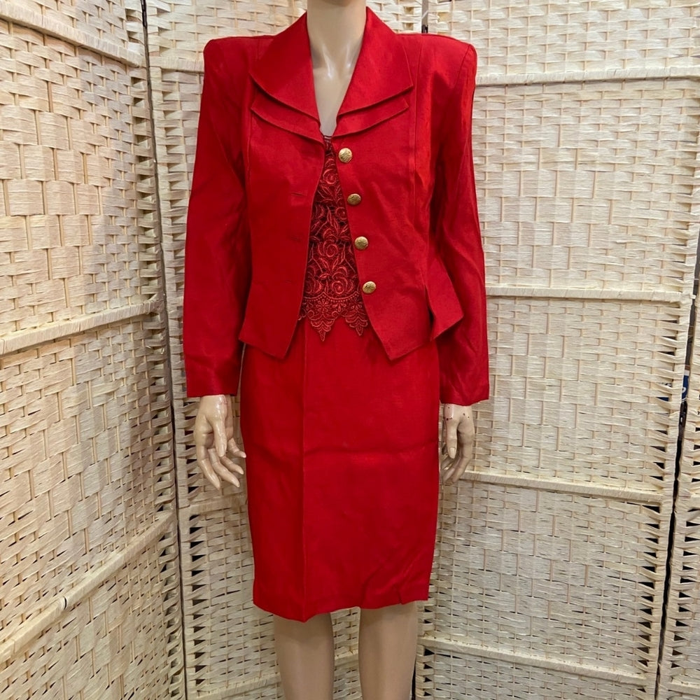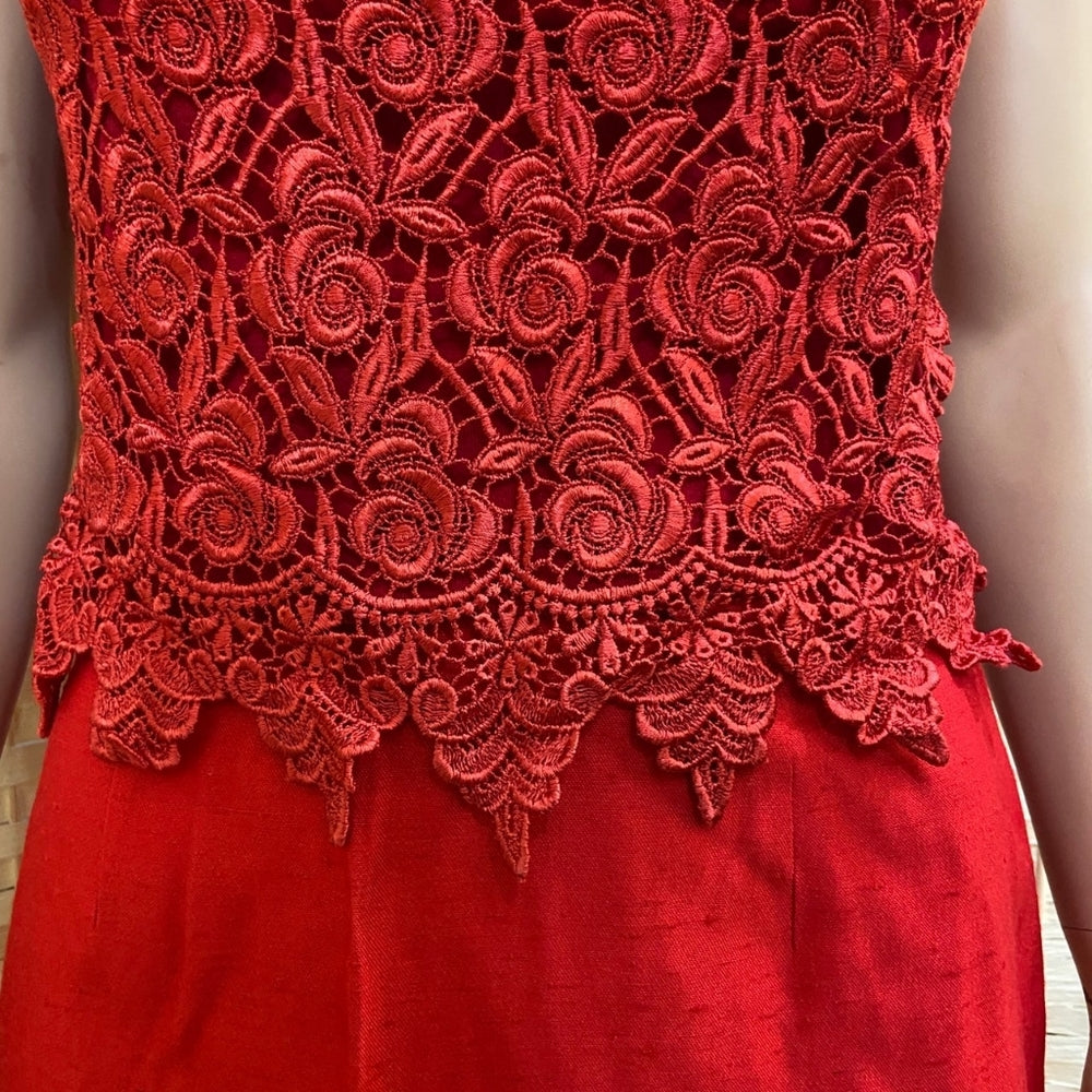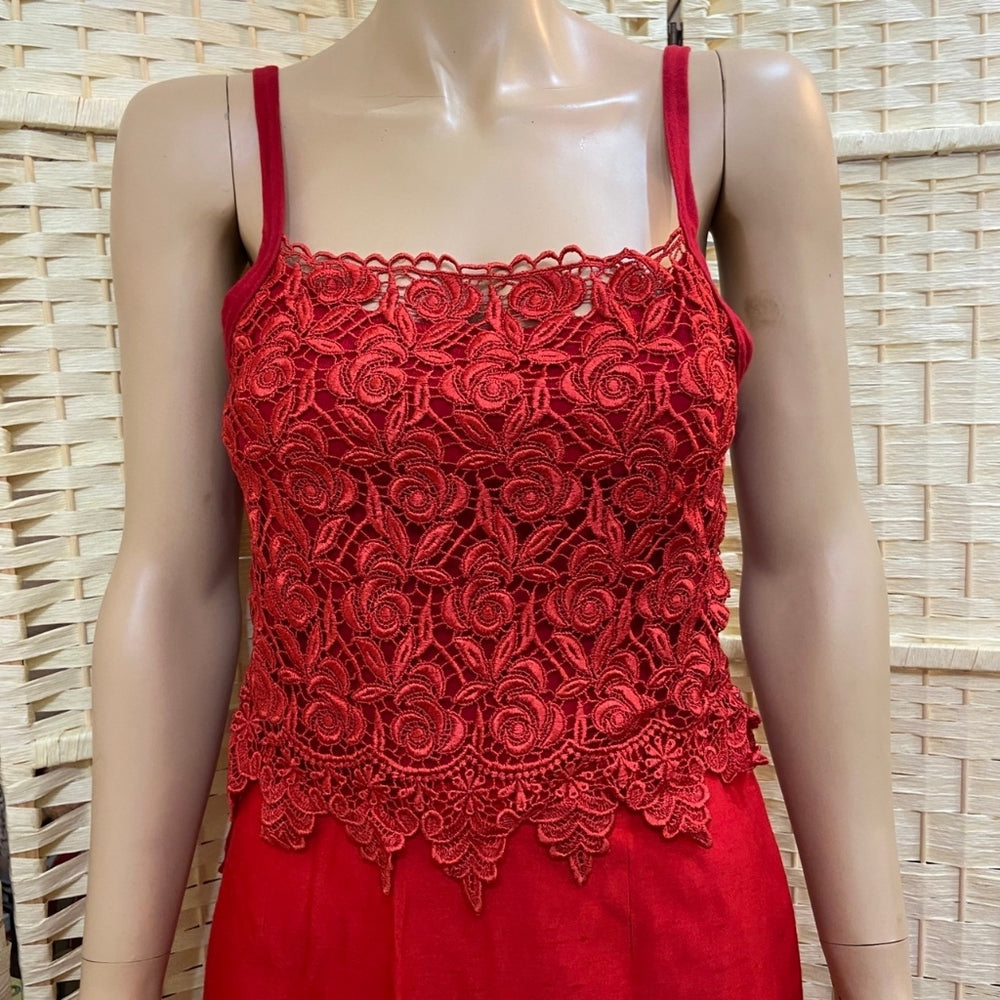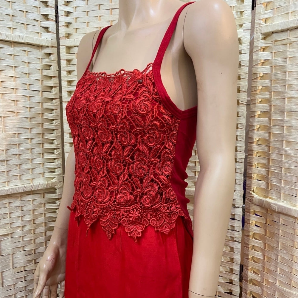 This is a gorgeous lacey tanktop in the color red. The back side is stretchable for more comfortable fit. It is in good condition with minimal wear as shown in photos. This will fit Size: S, actual measurements follow: