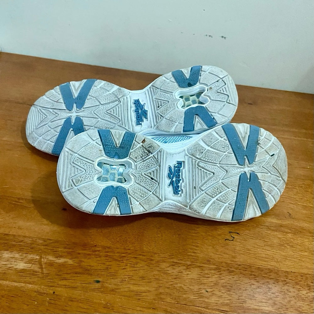 This is a beautiful pair of rubber sneakers in colors of white and blue. It is Size 8 and it measures 10.5 inches long, 4 inches wide and 3.5 inches high including platform of about 1.5inches high. It is in good condition as shown in photos.