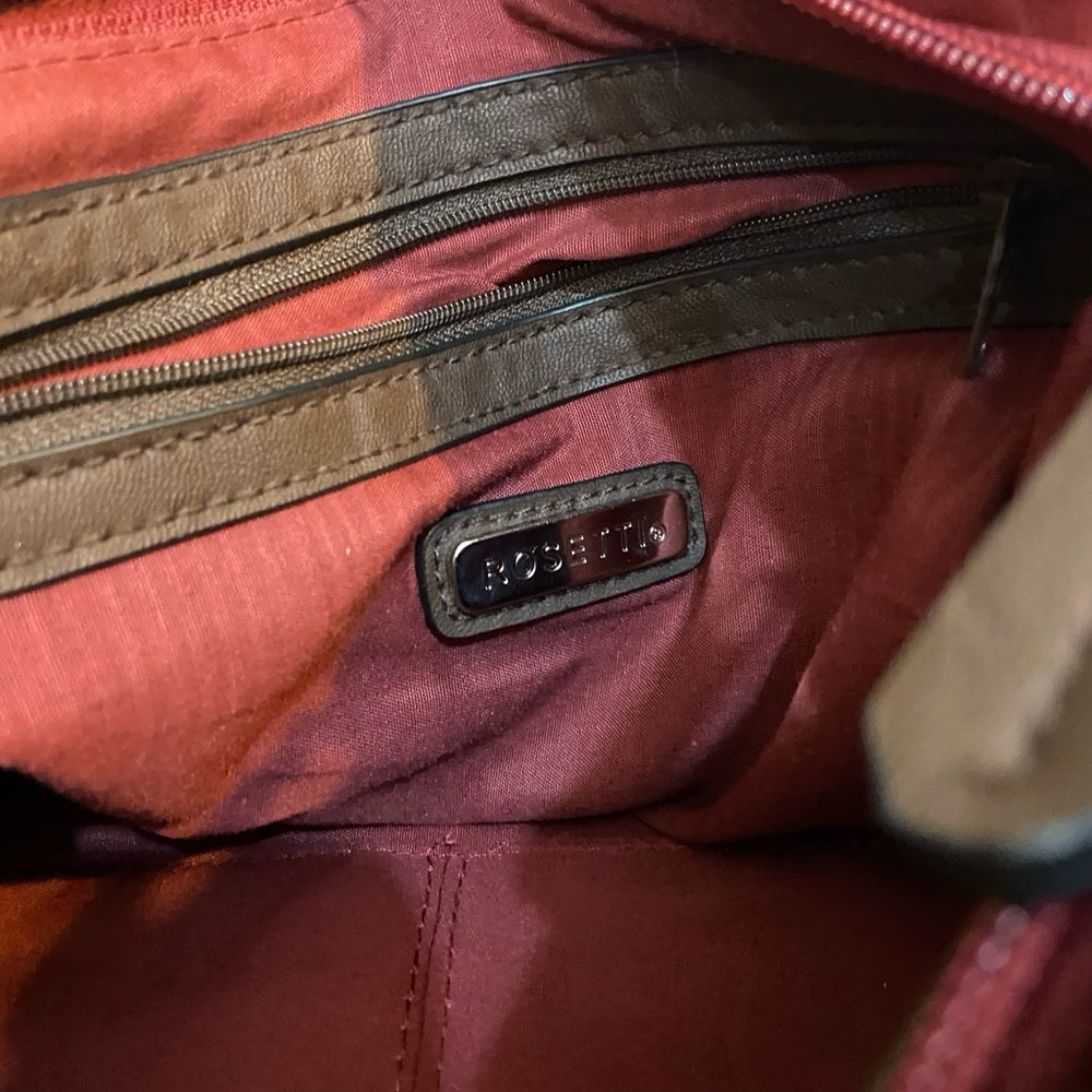 This is a beautiful crossbody bag made of red and brown faux leather and comes with a 45-in crossbody strap. It measures 12 inches long, 10 inches high and 4.5 inches wide. It has an exterior pocket and 2 zipper pockets. The interior has one compartment with 2 pockets. It is in very good condition as shown in photos. Pictures are worth a thousand words so please super size photos for condition details.