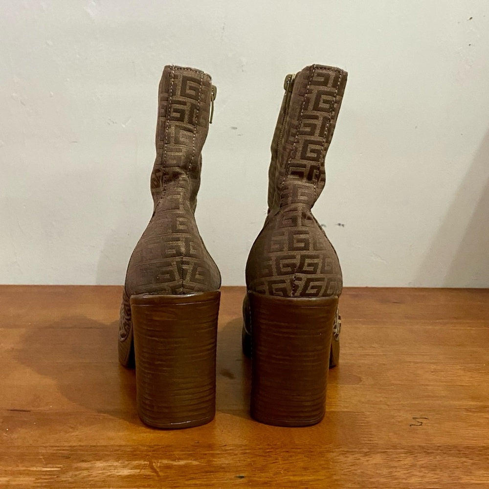 This is a beautiful pair of boots made of brown canvas with G designs on it. It is Size 9 and it measures 12 inches long, 3.5 inches wide and 9.5 inches high. The heels is 3.5 inches high. It is in very good condition with minimal wear as shown in photos.