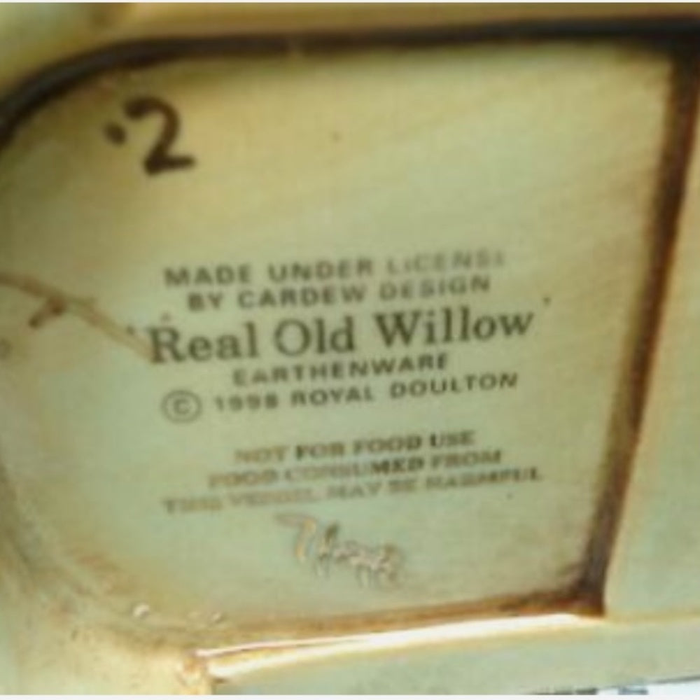 This is a beautiful, extra large, 2-pc figural teapot depicting a Wash Stand with a Wash Bowl and Ewer set as the the lid, decorated with the popular blue willow pattern, together with a soap dish, a comb and a towel. Together, this teapot measures about 8.5 inches high, 11.5 inches long and about 5.5 inches wide. It is in very good condition with minimal wear as show in photos. It is marked: Made under license by Cardew Design, (c) 1998 Royal Doulton, Real Old Willow Earthenware. Packaged weight is about 5 lbs.