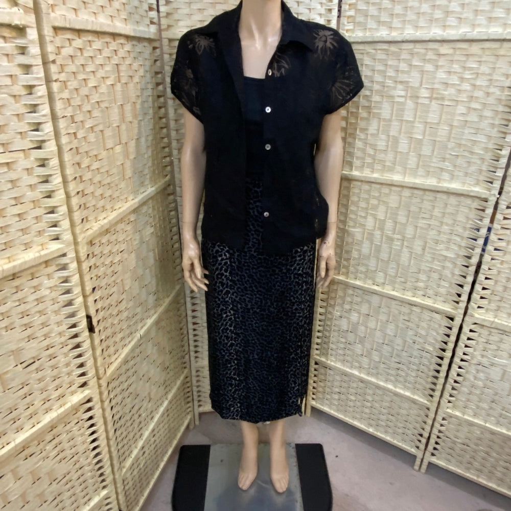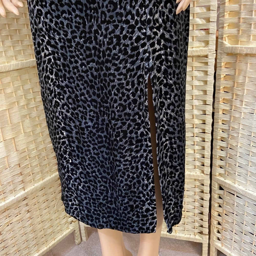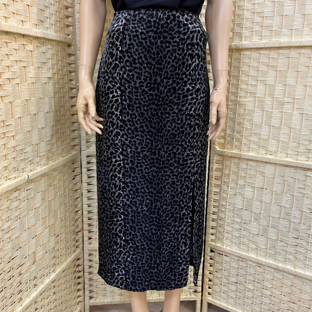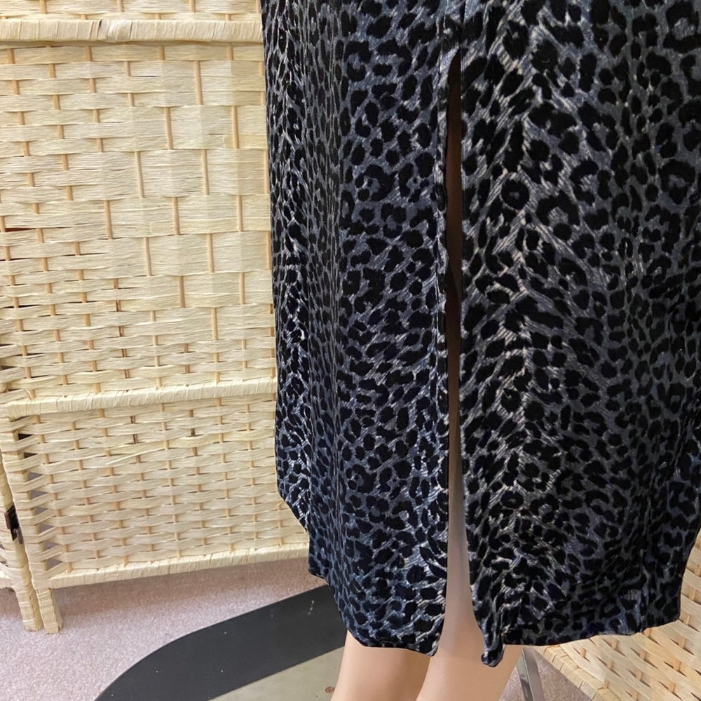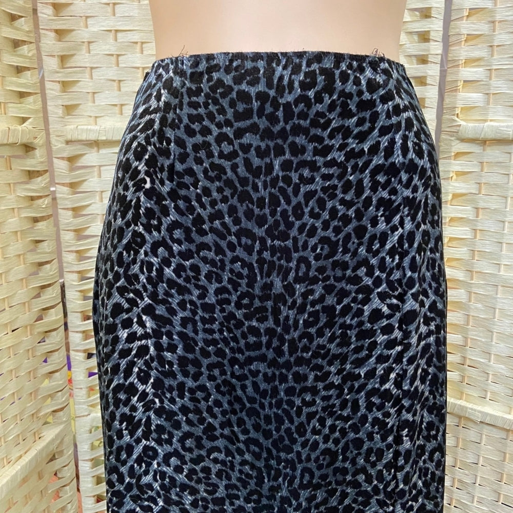 This is a beautiful cheetah print skirt in a beautiful silver blue and black color and velvety texture. It has a elastic waistband and a slit, and is in good condition as shown in photos. It will fit a Size: M, actual measurements to follow: