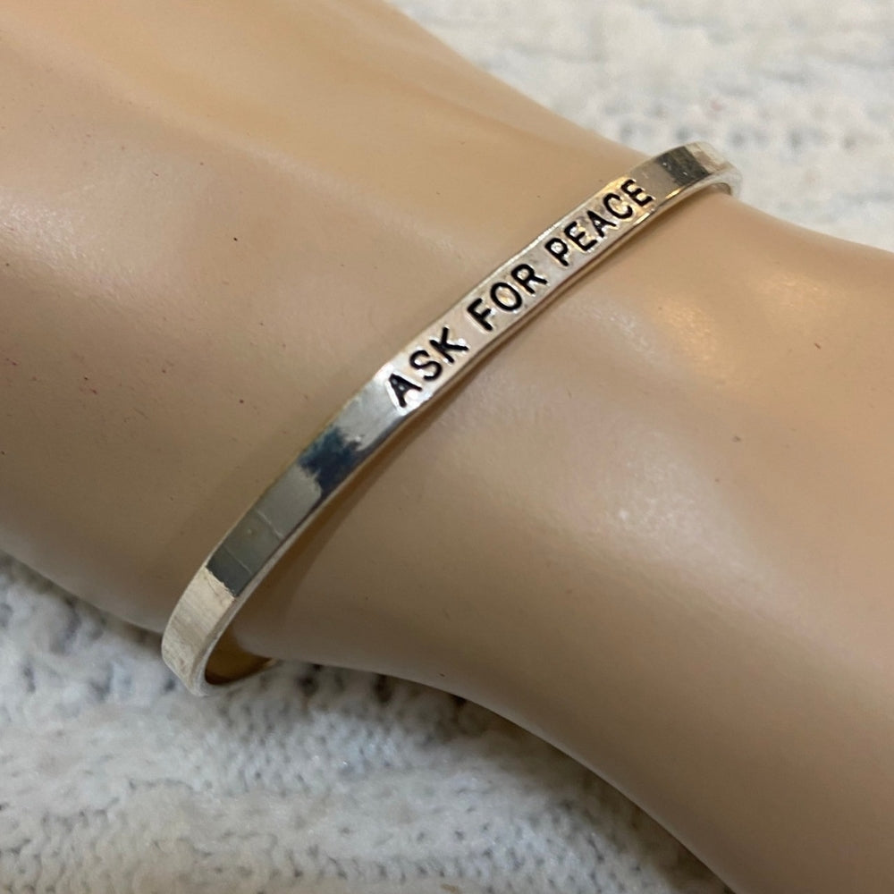This is a beautiful silver bangle or cuff with an engraved message stating, "ask for peace." It is in good condition as show in the photos above, and measures 6.5" circumference and 0.25" wide. Please super size photos for condition details.