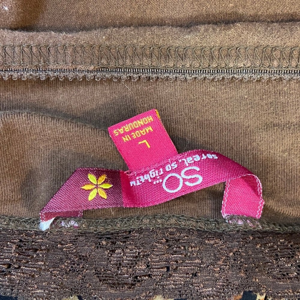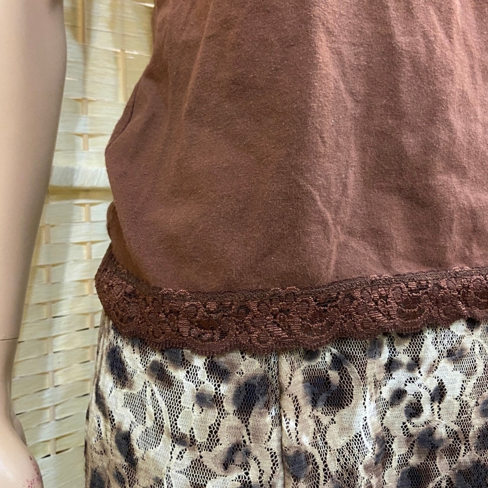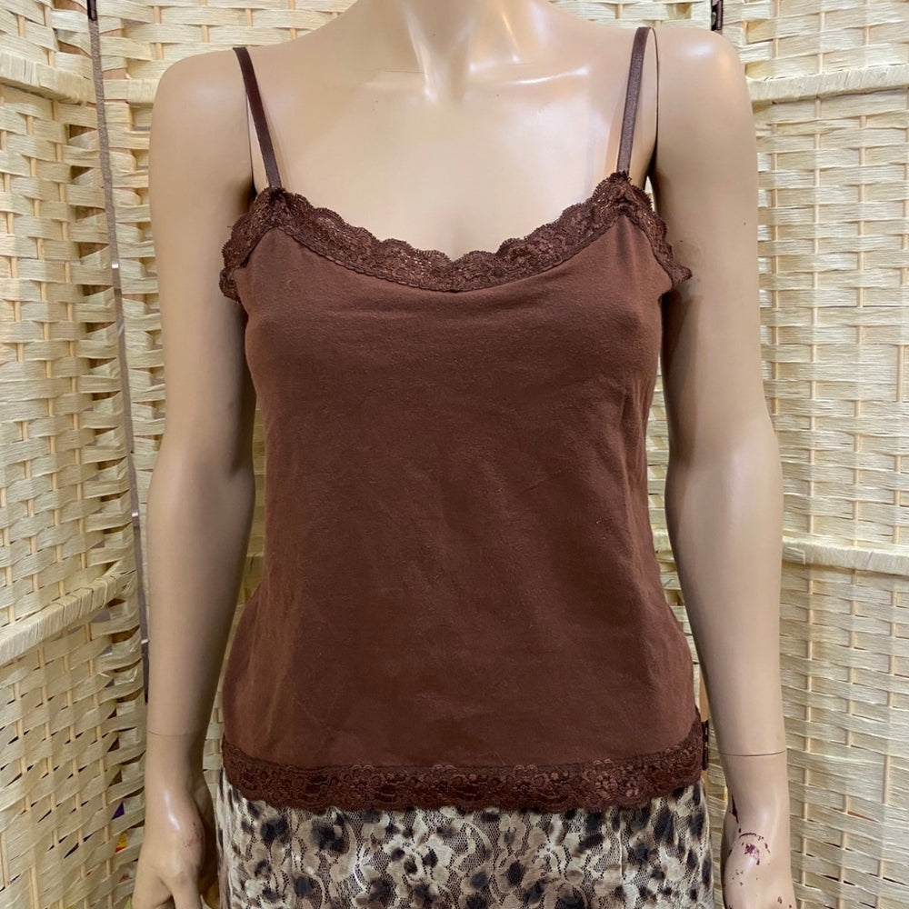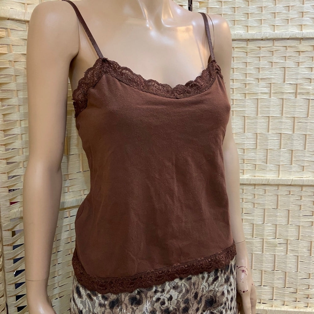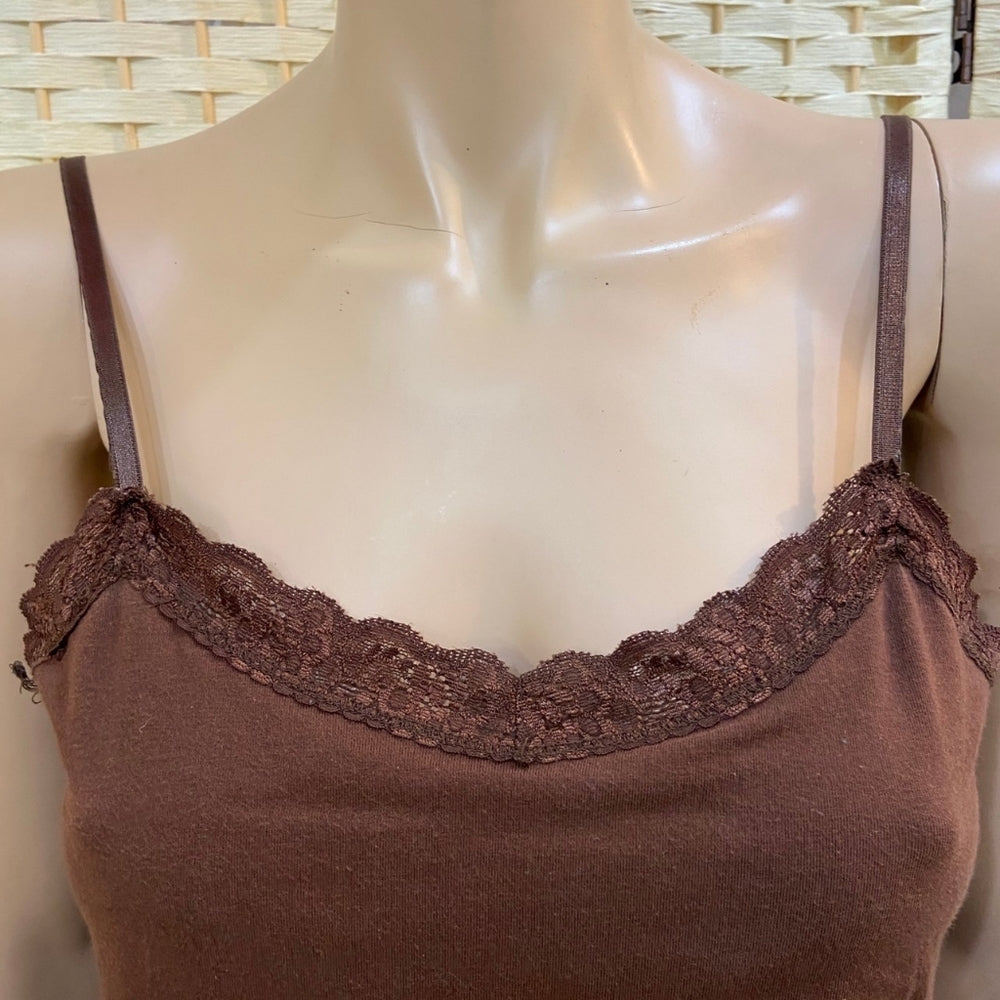 This is a gorgeous lace trim tanktop in the color brown. It is in good condition with minimal wear as shown in photos. This will fit Size: L, and can be stretched to fit larger, actual measurements follow: