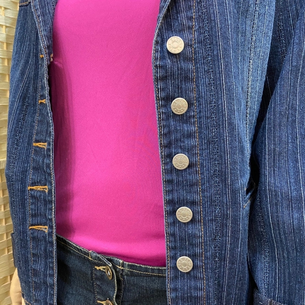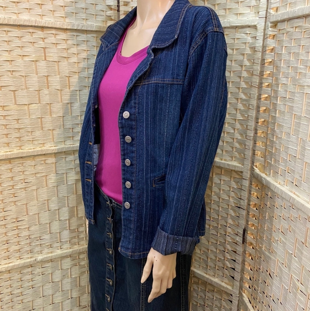 This is a beautiful denim jacket that is in good condition with minimal wear as shown in photos. This will fit size: L, actual measurements to follow: