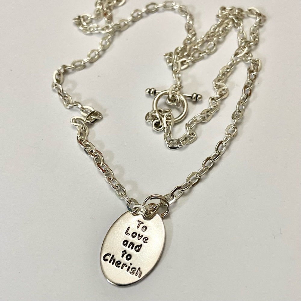 To Love and To Cherish, 1in x 1/2in Silver Tone Pendant Necklace (C0223)