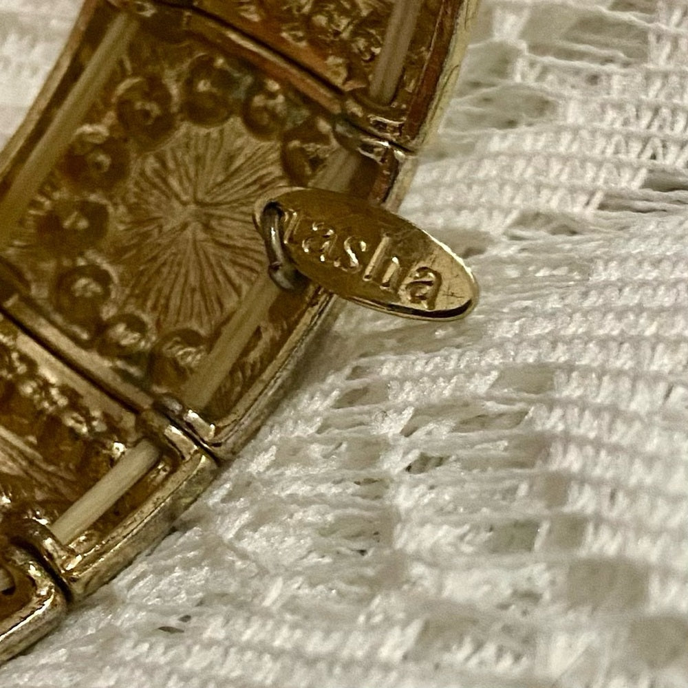 This is a beautiful, vintage, chunky, stretchable bracelet decorated with turquoise or teal blue stones and clear crystals. It is very good condition as shown in the photos. It measures 8.5 inches in circumference and 1 inch wide. Please super size photos for condition details.