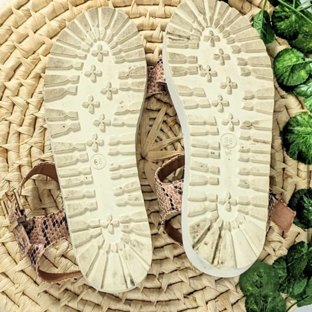 Faux Snakeskin on upper part of sandal. Adjustable buckle closure on ankle strap. Non-functioning instep strap. Interior lining.Cushioned insole, rubber outsole with 1-inch heel. Upper material is man made. The sole measures 10 inches long and about 3 inches wide. It is in good condition as shown in photos.