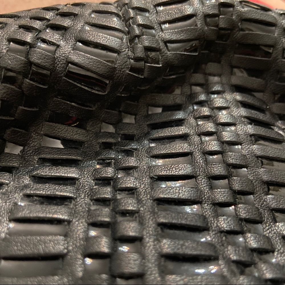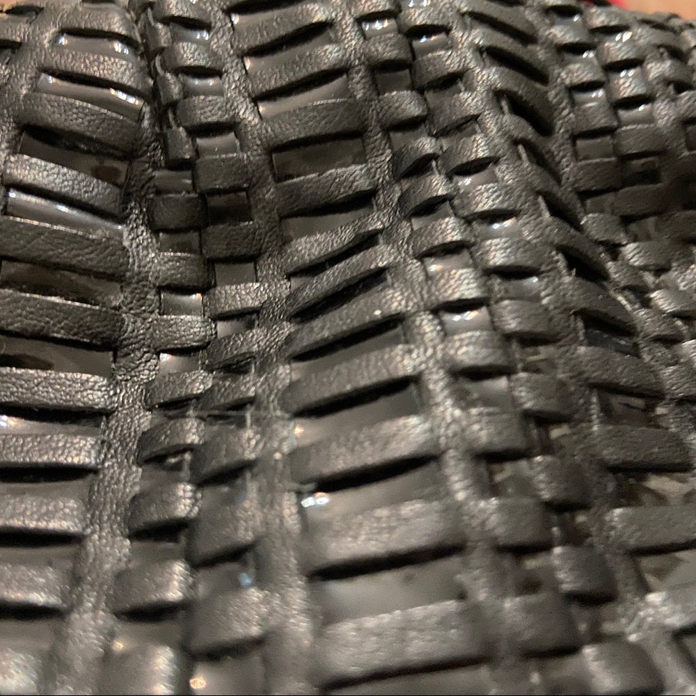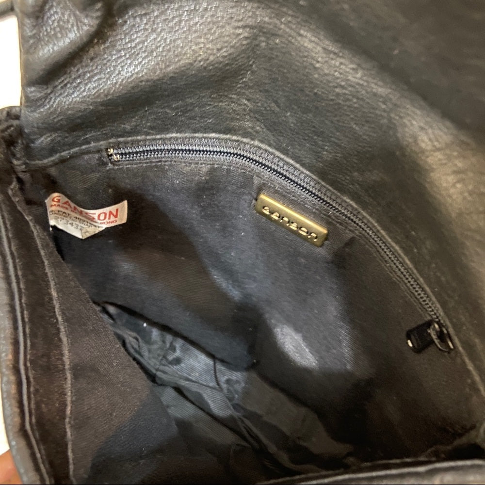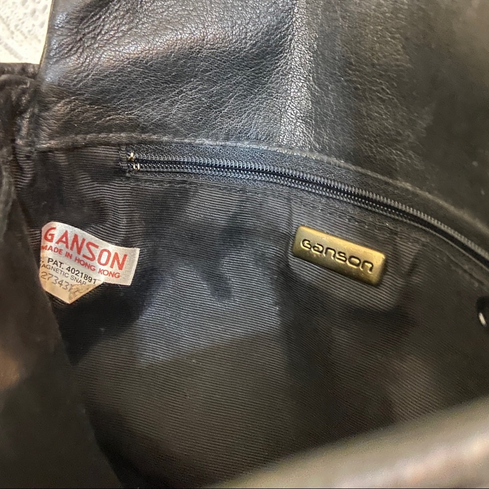 This is a vintage, pre-owned, black Leather woven shoulder bag. It measures 9 inches high, 8 long and 2.5 inches wide and it comes with a 26-inch shoulder strap. It is in good vintage condition with minimal wear as shown in photos. It has a metal and fabric label marked Ganson. Please read conversation for more info.