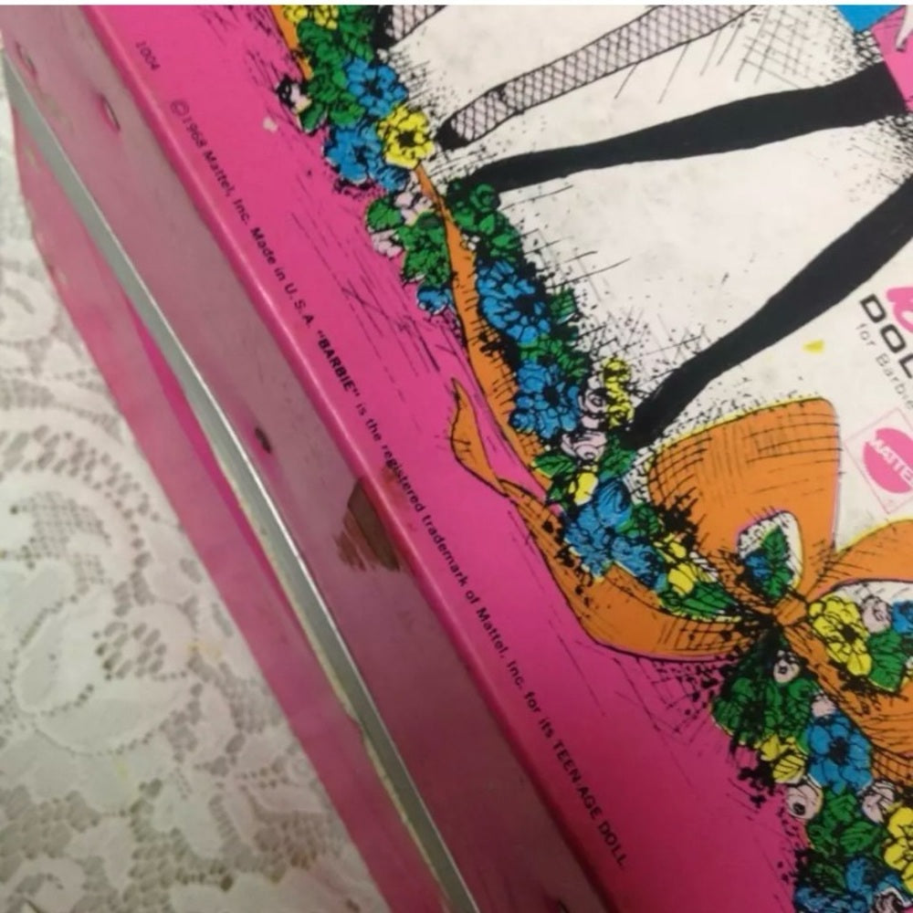 The doll trunk measures 13 inches long, 10.5 inches wide and 7.5 inhces deep It is in good condition with normal wear as shown in photos. It is marked: Barbie Doll Trunk, 1968 Mattel Incl, USA,