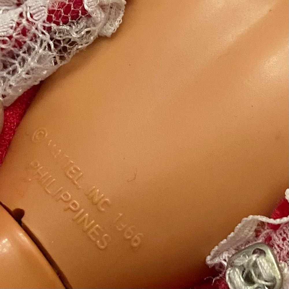 This is a beautiful Barbie Doll in her original white and red velvet gown. She measures about 12 inches high. She is in good vintage condition with minimal wear and soiling as shown in photos. She is missing her shoes and her hair needs grooming. It is marked: Mattel Inc. 1966, Philippines.