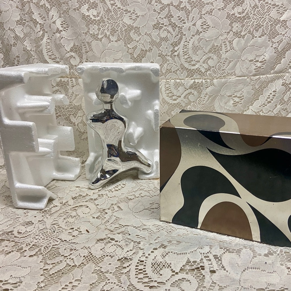 This is a beautiful and rare collectible Cologne decanter, depicting a futuristic human figure made of silvered glass. It measures about 8 inches high, 5 inches long and 3.5 inches wide. The original box measures 9 inches high, 6 inches long and 4 inches wide. This is unused or new in box (NIB) with original contents and sticker as shown in photos. Please supersize photos for condition details.