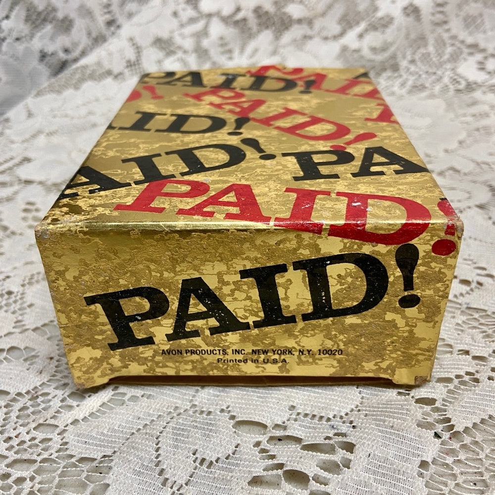 This is a beautiful and rare collectible after shave decanter, depicting a rubber stamp decanter made of brown glass with red PAID stamp on it. It measures about 5 inches high, 4 inches long and 2 inches wide. The original box measures 6 inches high, 4 inches long and 2 inches wide. This is unused or new in box (NIB) with original contents and sticker as shown in photos.
