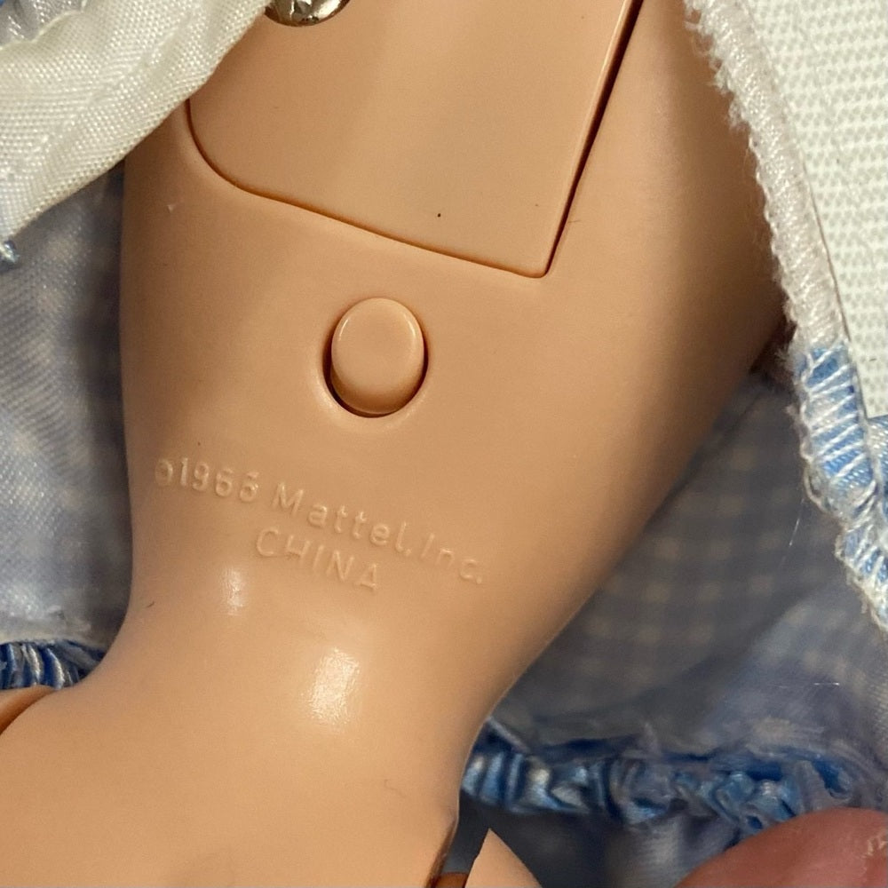 This is a beautiful Doll depicting the Wizard of Oz, Dorothy in her blue and white dress. She measures about 12 inches high. She is in good vintage condition with minimal wear and soiling as shown in photos. She is missing her shoes and her hair needs grooming. It is marked: 1966, Mattel Inc., Made in China.