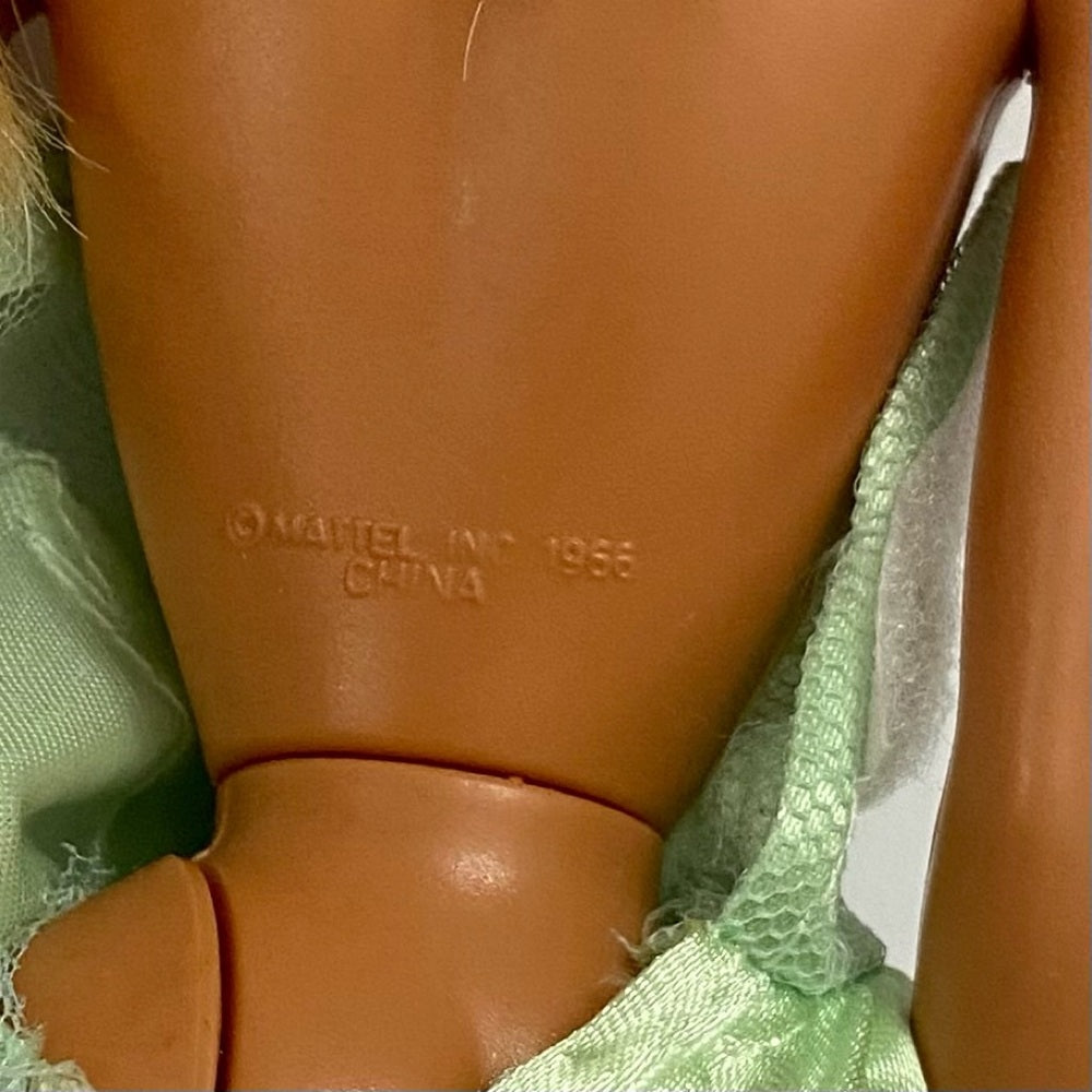 This is a beautiful Barbie Doll in elegant green lacy gown. It measures about 12 inches high and in good vintage condition with minimal wear and soiling as shown in photos. She wearing a gray high heel shoes but her hair needs grooming. It is marked: Mattel Inc, 1966, China. This was probably made during the 1980s.