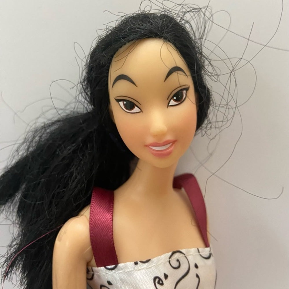 This is a beautiful Barbie Doll in her white printed mini dress. She measures about 12 inches high. She is in good vintage condition with minimal wear and soiling as shown in photos. She is missing her shoes and her hair needs grooming. It is marked: Made in China. This was probably made during the 1990s.