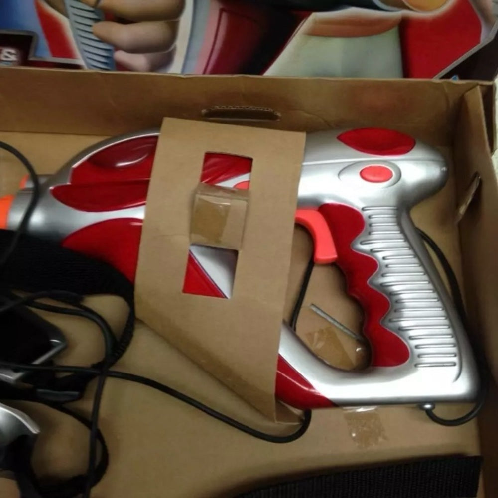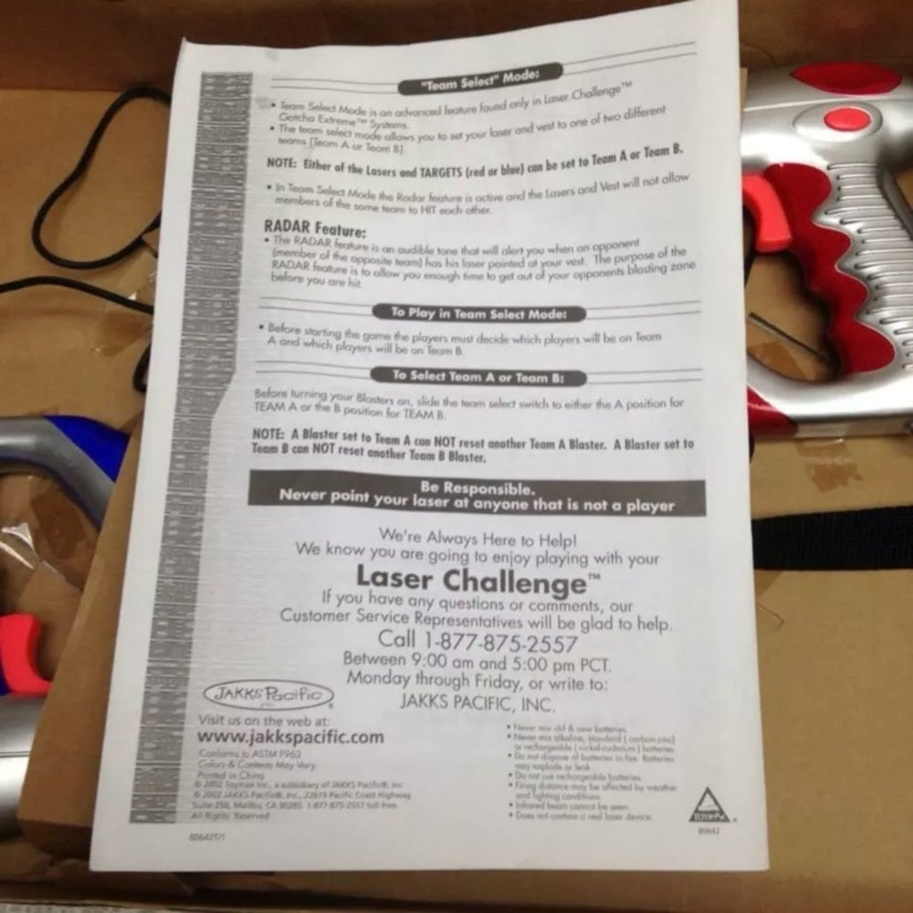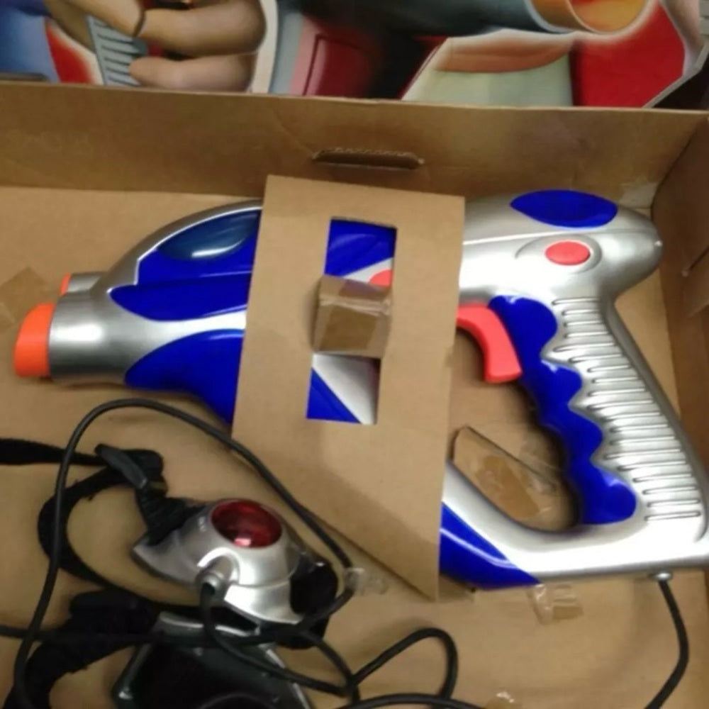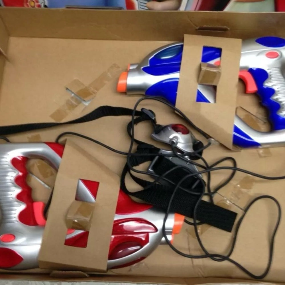 This is a beautiful 2 set of lasers blasters and tethered sensor vests in original box. It is in good condition as shown in photos. It is marked: 2002 Toymax Inc., 80642.