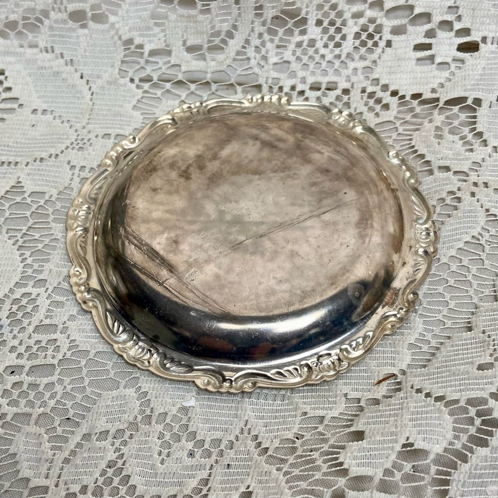 This is a beautiful, silverplated cup and saucer decorated with the popular blue willow pattern. The blue willow is not original but was added by a blue willow enthusiast. Each cup measures 3 inches high and 4 inches wide; each saucer measures 4.5 inches in diameter. The cups are marked: Nickel Silver; the saucers are marked: Silver Plated, EP on steel, Italy. It is in good vintage condition with minimal wear as shown in photos.