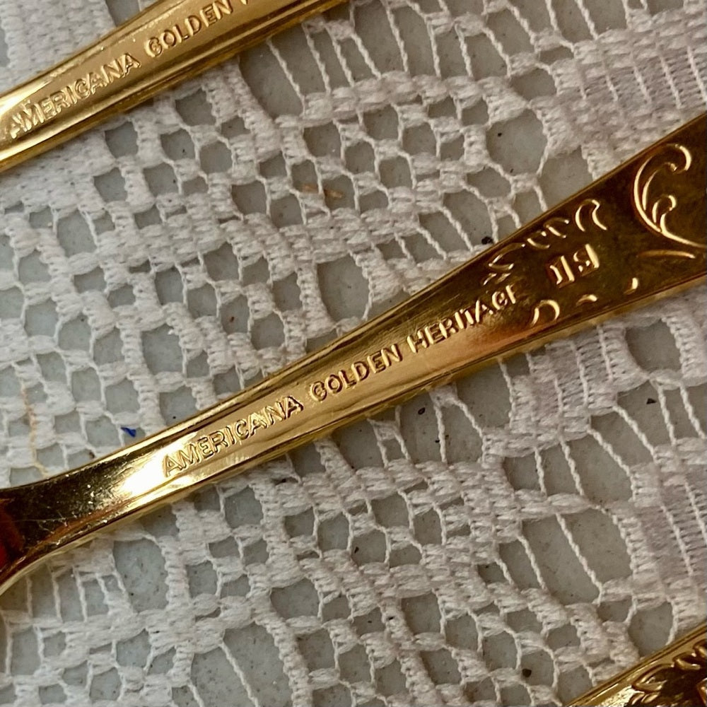 It is missing one salad fork but overall it is in good vintage condition with minimal wear as shown in photos. It comes with a wooden box. The set is marked: Americana Golden Heritage. The package weight is about 10 pounds.