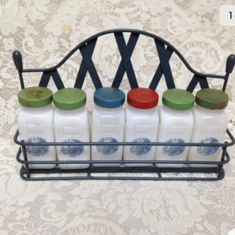 This is a rare, shaker set of 6 with metal rack and decorated with the popular blue willow pattern. The metal stand measures about 7.5 inches tall, 11 inches long and about 3 inches thick. Each shaker measures about 4.25 inches tall, and 1.75 inches square. The milk glass spice jar set is in good vintage condition with normal age wear and discolarion as as shown in photos. Take note there are 4 green lids, 1 blue and 1 red. Also, original labels are missing. The blue willow designs are faded and seems to be added by a blue willow enthusiast. Package weight is about 4 lbs.