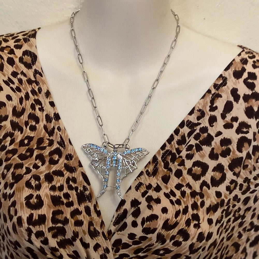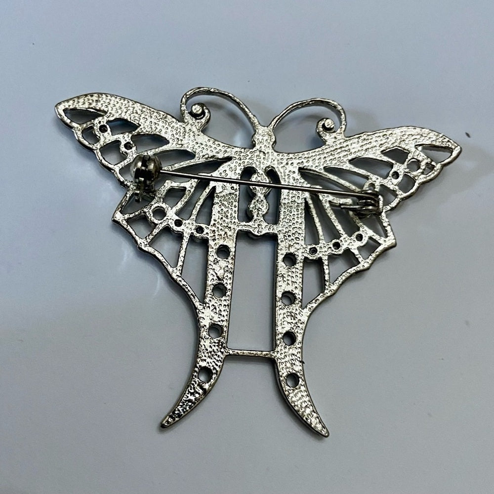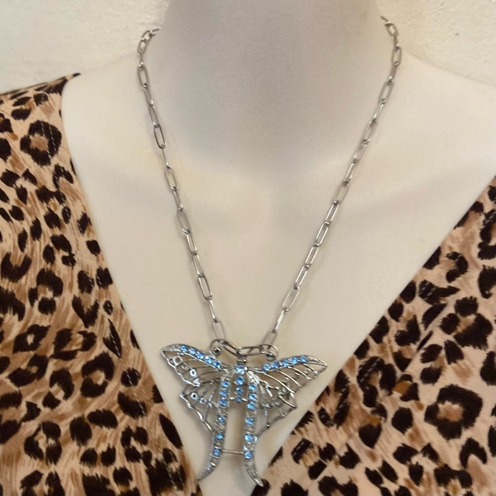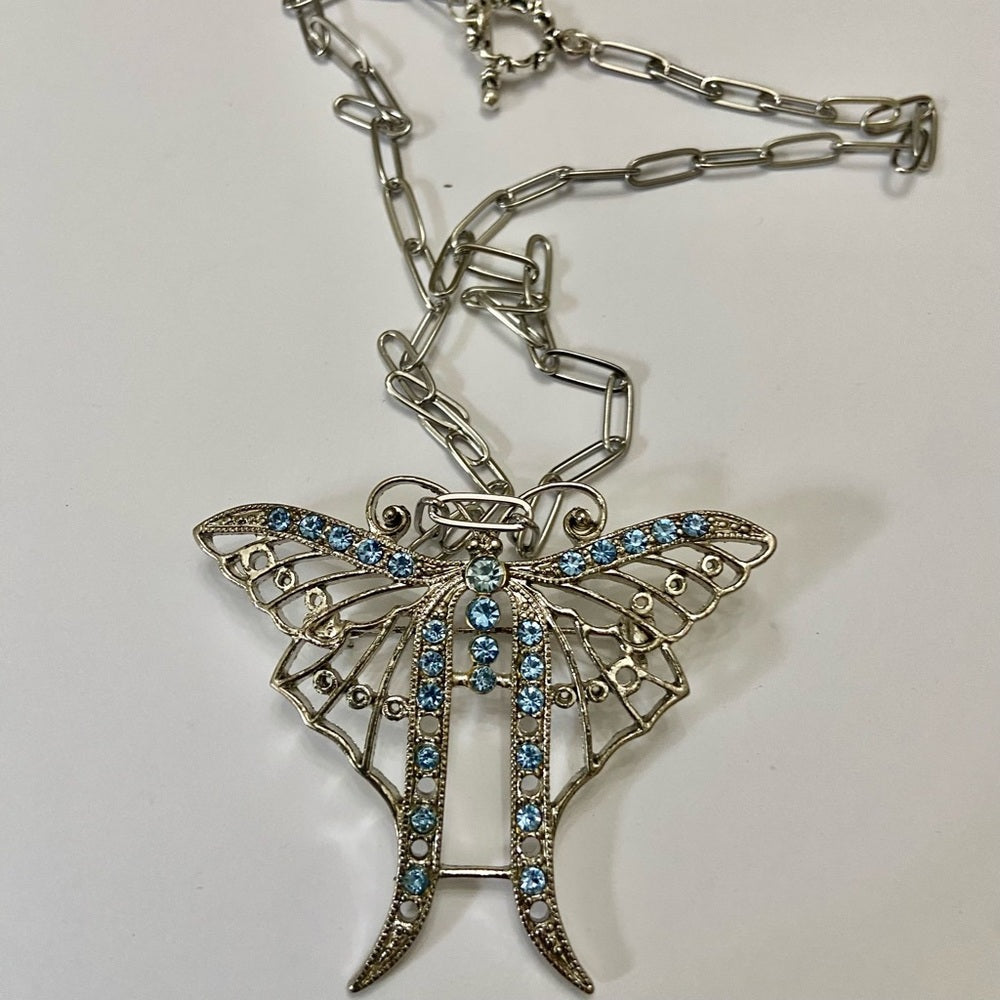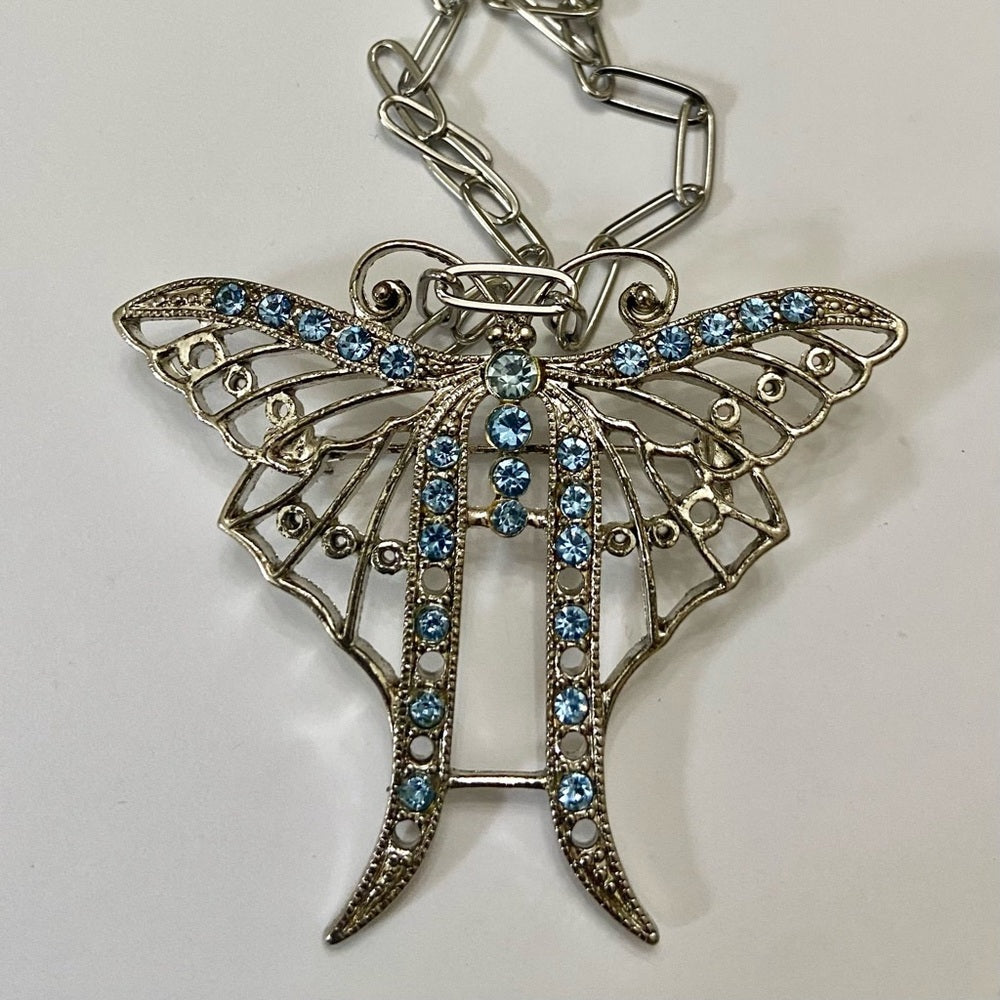 This is a beautiful, large, silver tone butterfly brooch or pendant necklace and it measures 2.5 inches long and 2 inches wide and comes with am 18inch silver tone chain necklace. The brooch is made of silver tone metal with blue rhinestones in it. It is in good condition as shown in photos.