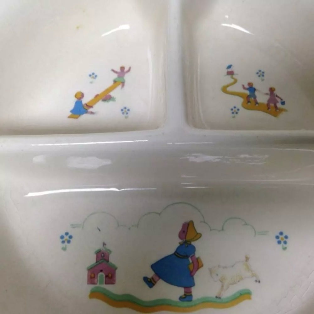 This is beautiful, infant dish with warmer made of ceramics and chrome-plated and depicting Bopeep and Jack and Jill. It measures 2.5 inches high, 9 inches wide or about 8 inches in diameter. It has replaced steam cover, but overall it is in good vintage condition with minimal wear or fading as shown in photos. It is marked: Bartsch Mfg. Co., Chicago, Chrome plated, Patented D26-233, other Patents pending.