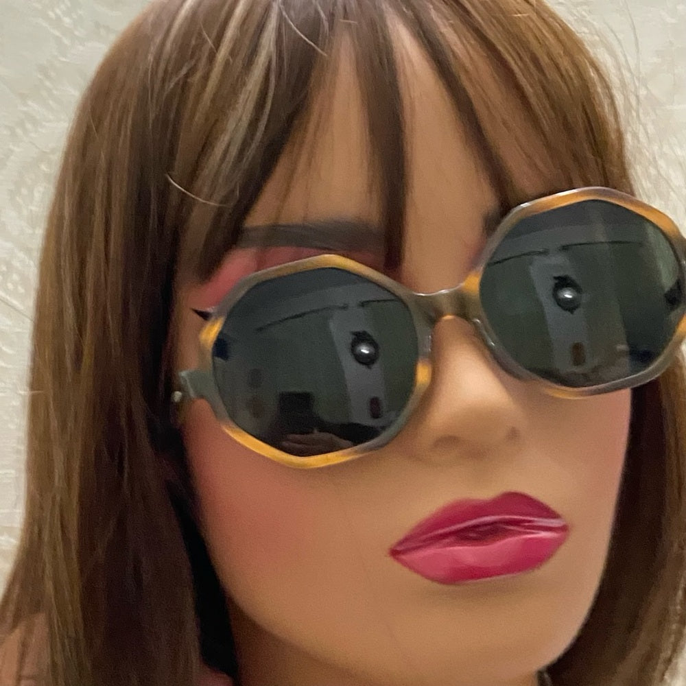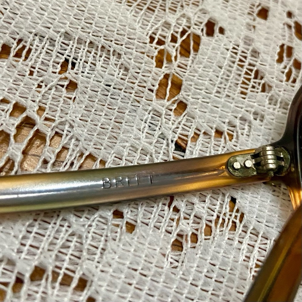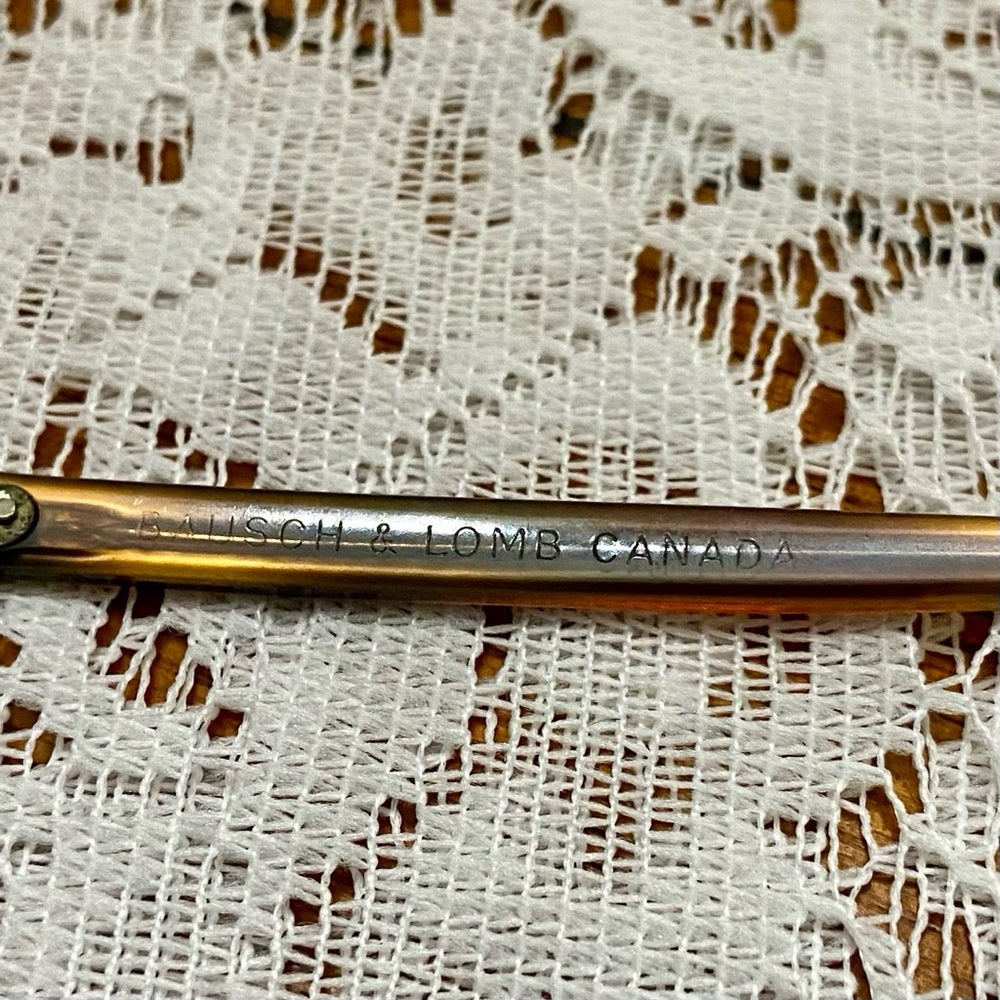 It is in good condition with minimal wear as shown in photos. The temple is marked: Bausch & Lomb, Canada. The other temple is marked: BRITT. The front measures about 5.5 inches long, and each lense measures about 3 inches long and about 2 inches high. It comes with a black case, not original as shown in photos.The temples might need to be adjusted or tightened.