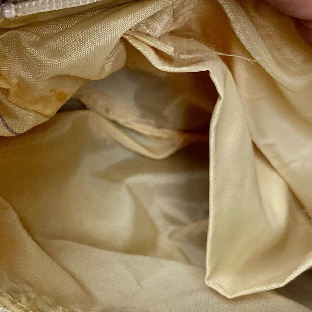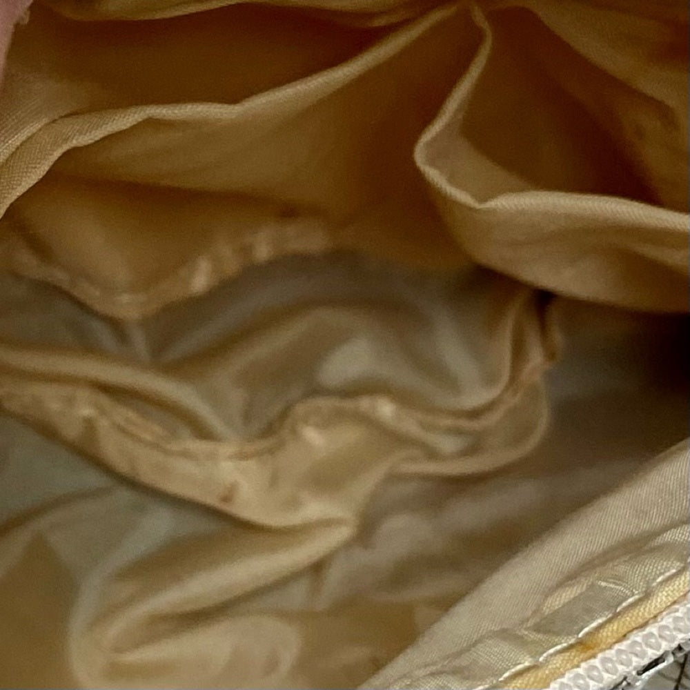 This is a beautiful pre-owned 2-way clutch or Shoulder Bag. It measures 9 inches long, 6 inches high and 1 inch wide. It comes with a beige chain strap of about 40 inches long. It is in good vintage condition with minimal wear and staining on the lining as shown in photos. Please super size photos for condition details.