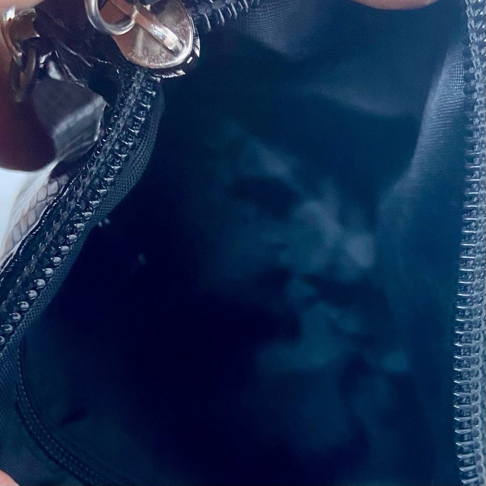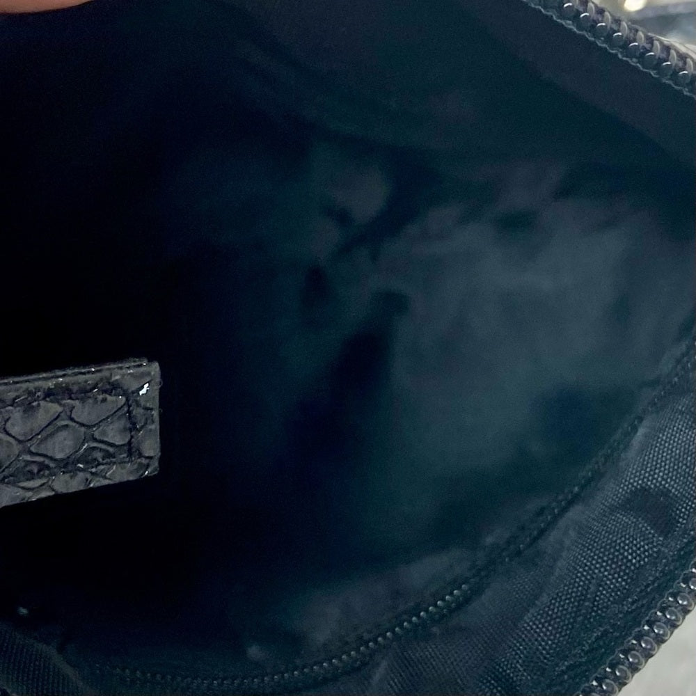 This is a pre-owned Wristlet or shoulder bag made of black faux snakeskin leather and it comes with 7in wristlet strap and 35in silver shoulder strap. It measures 8 inches long and 5 inches wide. It is in good condition with minimal wear as shown in photos. Please supersize for condition details..