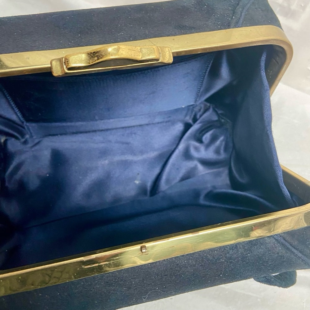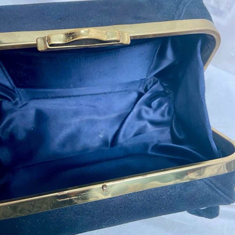 Vintage, Black Suede Leather, Boxy Gold Clasp Handbag 8in x 4.5in x 3.5in