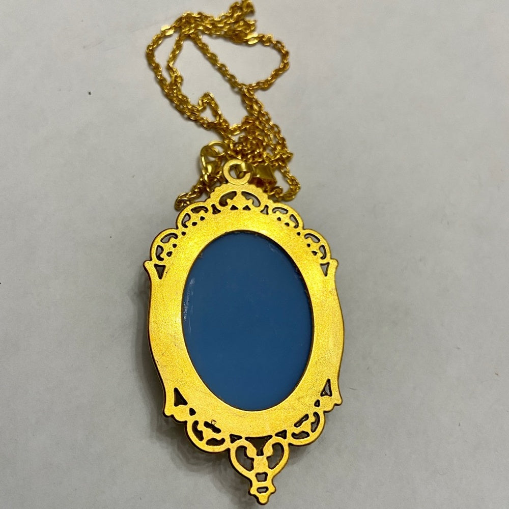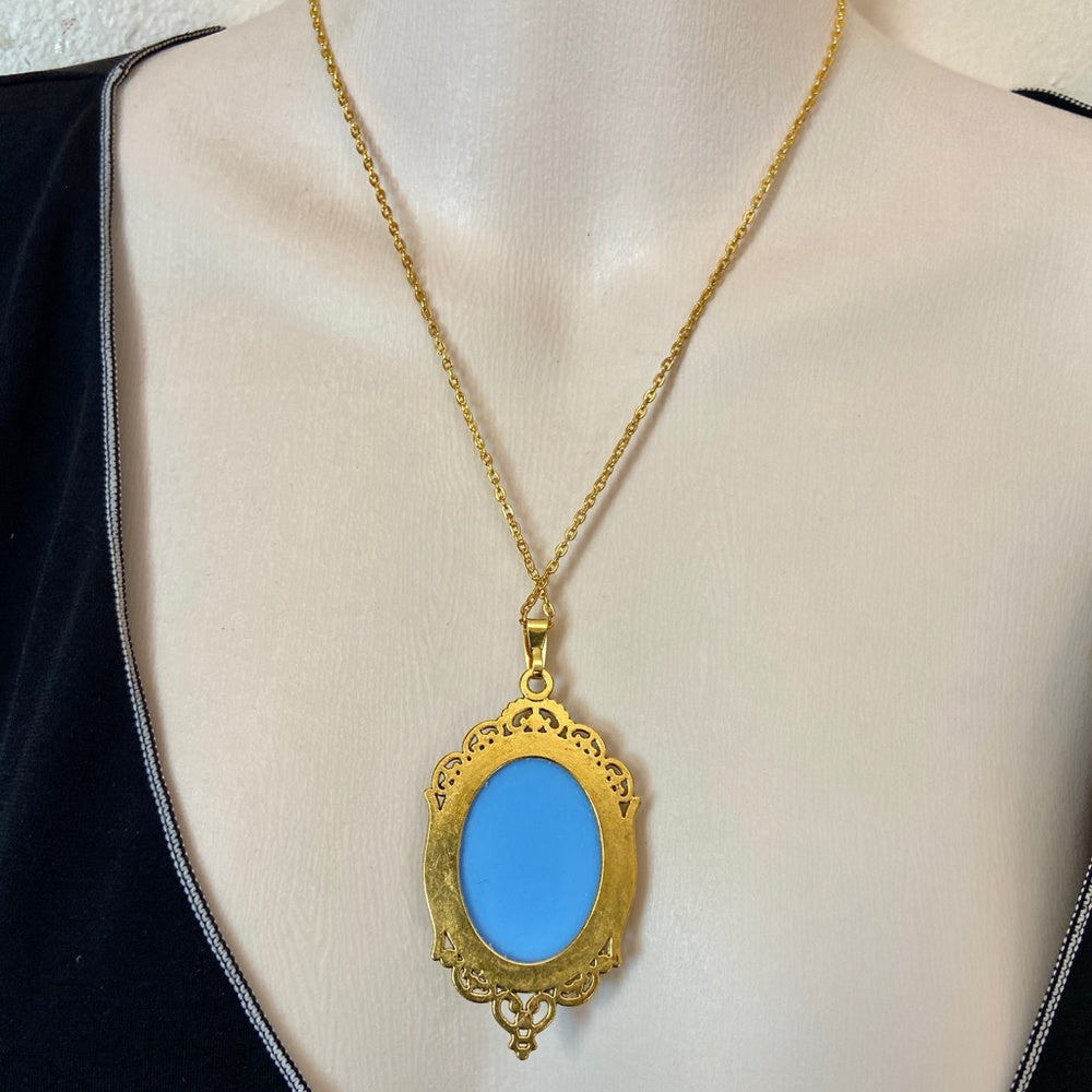his is a beautiful pendant necklace depicting a cameo of a Lady over a blue background. The cameo measures 2.5 inches long and 1.5 inches wide. It is in very good condition as shown in photos. Please super size photos for condition details.