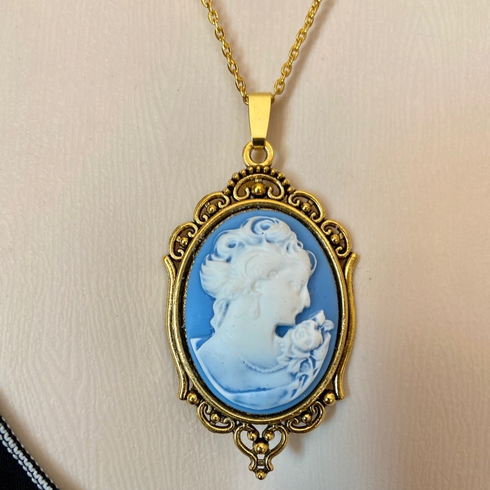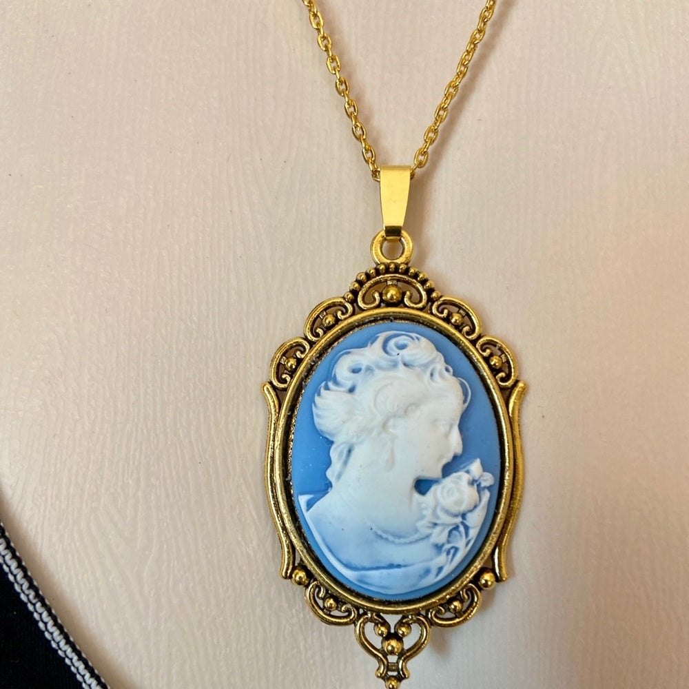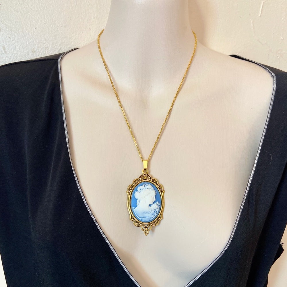 This is a beautiful pendant necklace depicting a cameo of a Lady over a blue background. The cameo measures 2.5 inches long and 1.5 inches wide. It is in very good condition as shown in photos. Please super size photos for condition details.